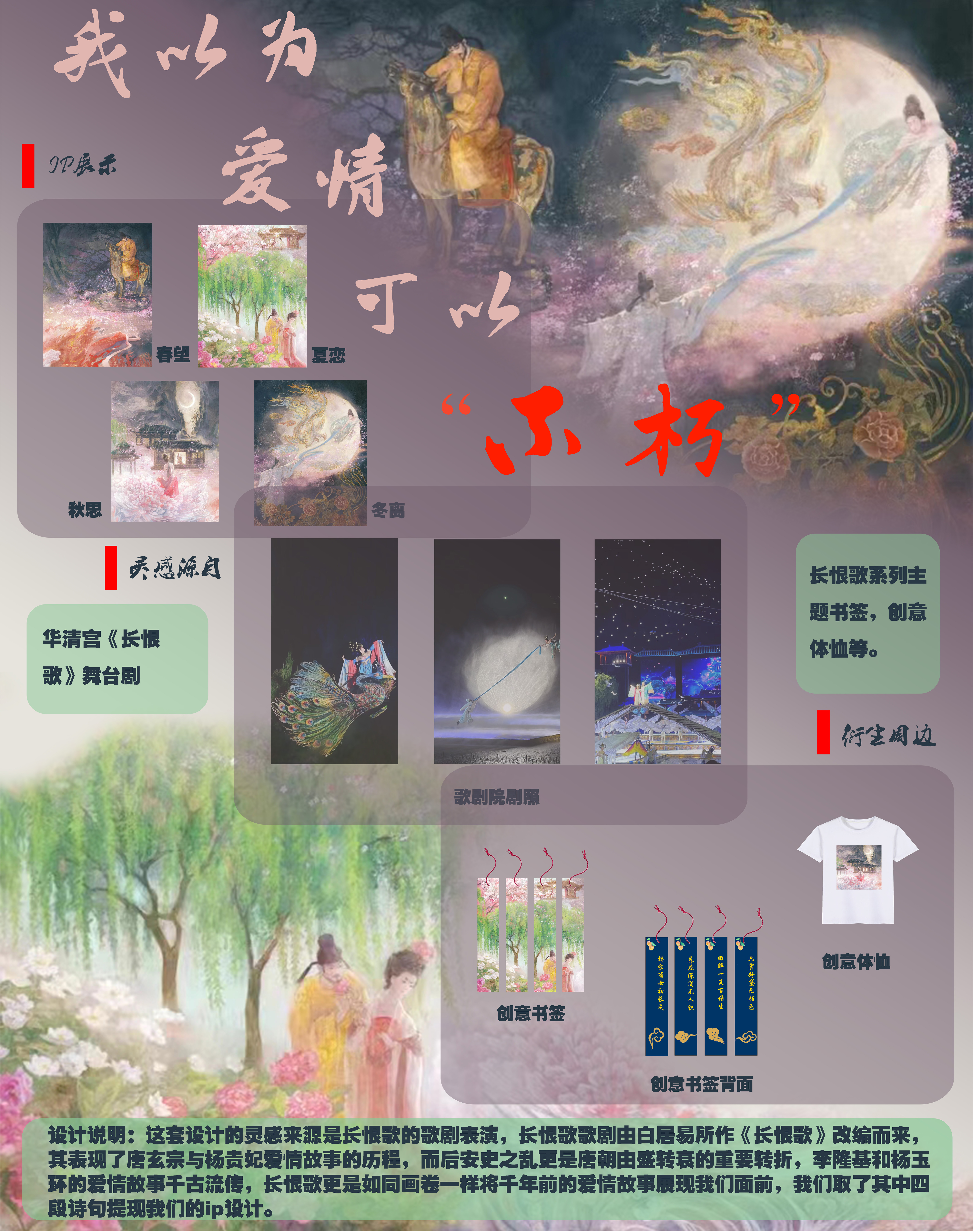 这套设计的灵感来源是长恨歌的歌剧表演,长恨歌歌剧由白居易所作《长恨歌》改编而来, 其表现了唐玄宗与杨贵妃爱情故事的历程,而后安史之乱更是唐朝由盛转衰的重要转折,李隆基和杨玉 环的爱情故事千古流传,长恨歌更是如同画卷一样将千年前的爱情故事展现我们面前,我们取了其中四 段诗句提现我们的ip设计。