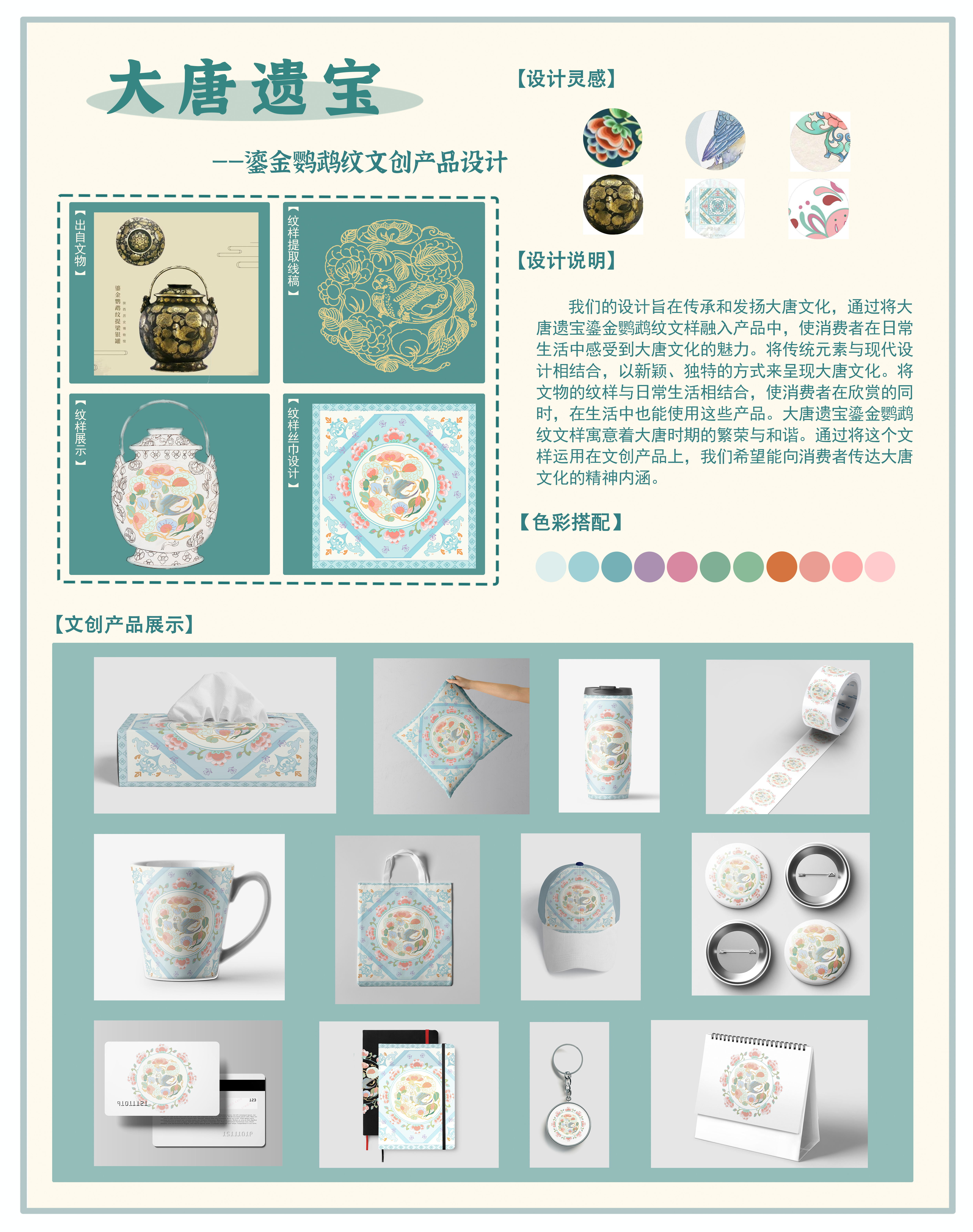 我们的设计旨在传承和发扬大唐文化,通过将大唐遗宝鎏金鹦鹉纹文样融入产品中,使消费者在日常生活中感受到大唐文化的魅力。将传统元素与现代设计相结合,以新颖、独特的方式来呈现大唐文化。将文物的纹样与日常生活相结合,使消费者在欣赏的同时,在生活中也能使用这些产品。大唐遗宝鎏金鹦鹉纹文样寓意着大唐时期的繁荣与和谐。通过将这个文样运用在文创产品上,我们希望能向消费者传达大唐文化的精神内涵。