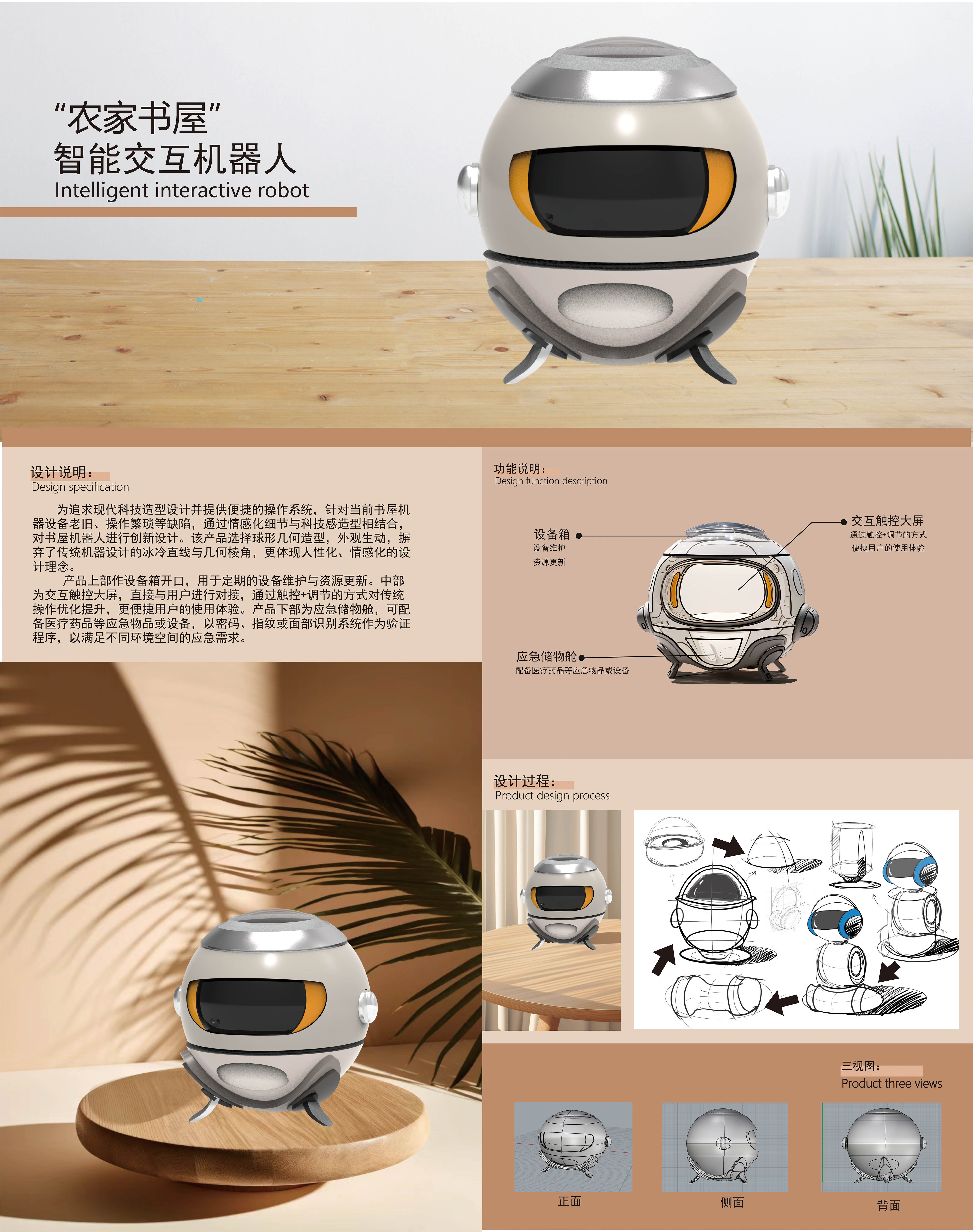 本产品通过情感化细节与科技感造型相结合,对书屋机器人进行创新设计。产品选择球形几何造型,摒弃了传统机器设计的冰冷直线与几何棱角,更体现人性化的设计理念。产品上部作设备箱开口,用于定期的设备维护与资源更新。中部为交互触控大屏,直接与用户进行对接,通过触控调节的方式对传统操作优化提升。产品下部为应急储物舱,可配备医疗药品等应急物品或设备,以密码、指纹或面部识别系统作为验证程序,以满足不同环境空间的需求