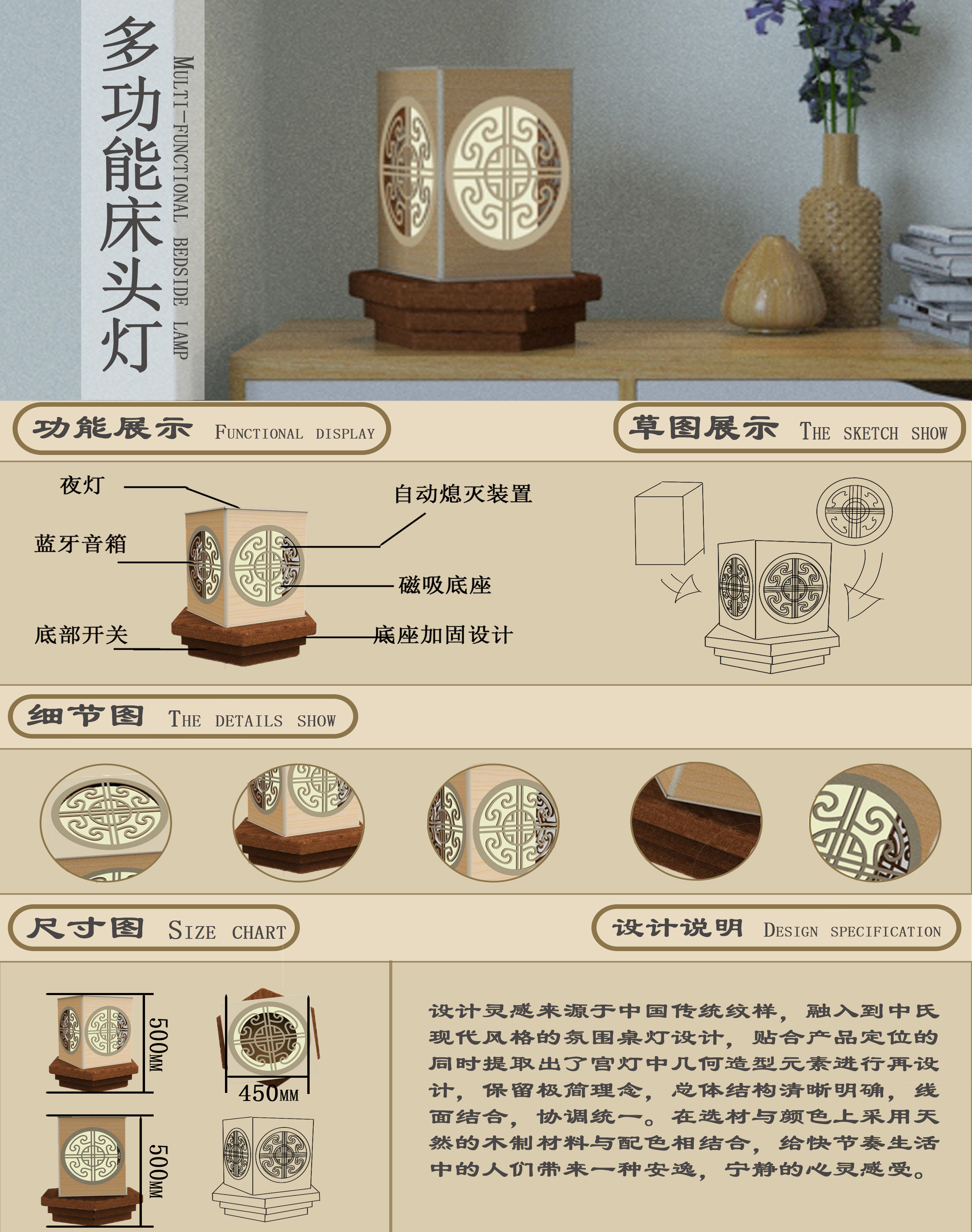设计灵诞来源于中国传统纹样,融入到中式现代风格的氛国泉灯设计,贴合产品定位的同时提取出了宫灯中几何造型元素进行再设计,保留极简理念,觉体结构清晰明确,线面结合,协调統一。在选材与颜色上采用天然的木制材料与配色相结合,给快节奏生活中的人们带來一种安逸,宁静的心灵盛受。