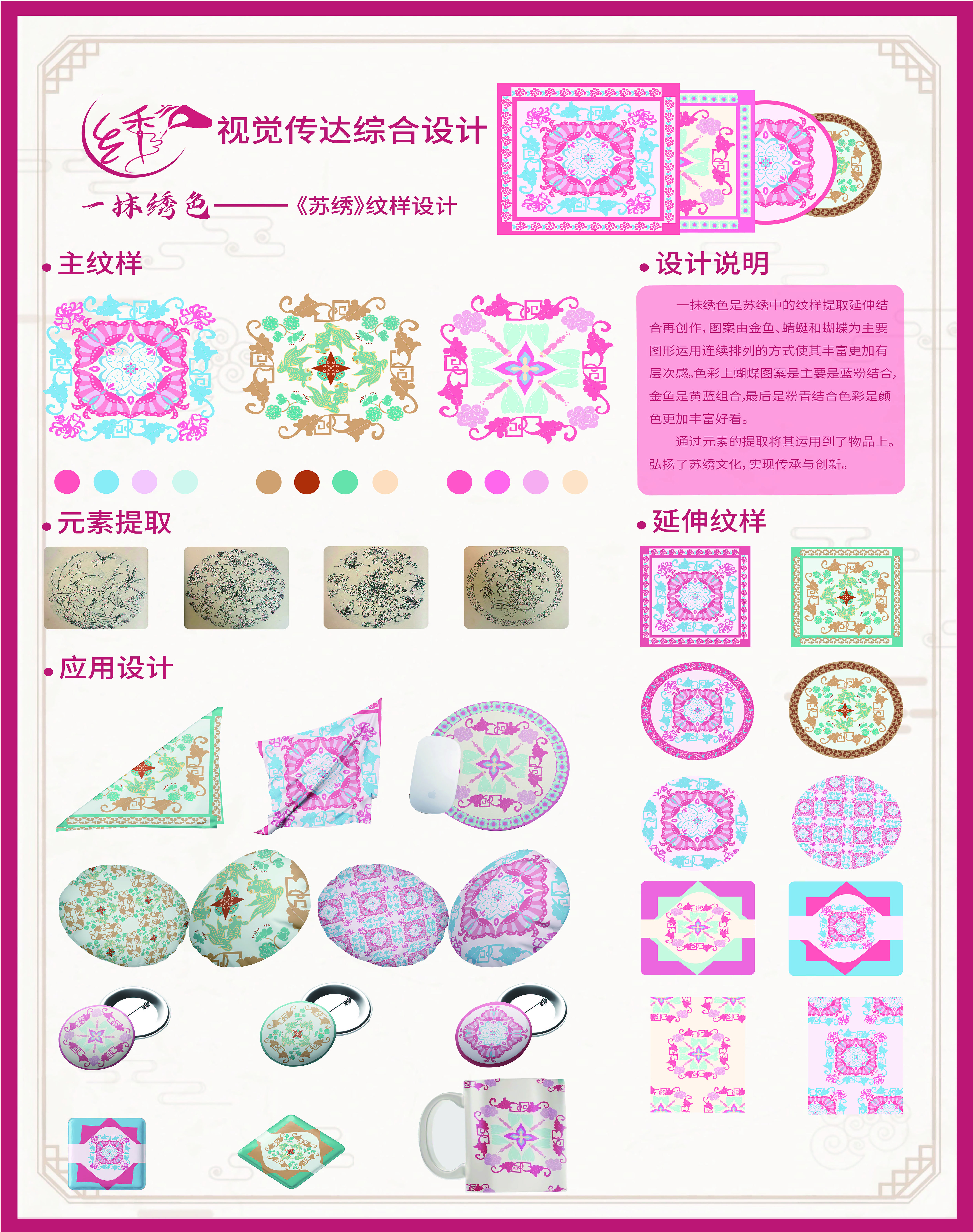 一抹绣色是苏绣中的纹样提取延伸结 合再创作,图案由金鱼、蜻蜓和蝴蝶为主要 图形运用连续排列的方式使其丰富更加有 层次感。色彩上蝴蝶图案是主要是蓝粉结合, 金鱼是黄蓝组合,最后是粉青结合色彩是颜 色更加丰富好看。 通过元素的提取将其运用到了物品上。 弘扬了苏绣文化,实现传承与创新。