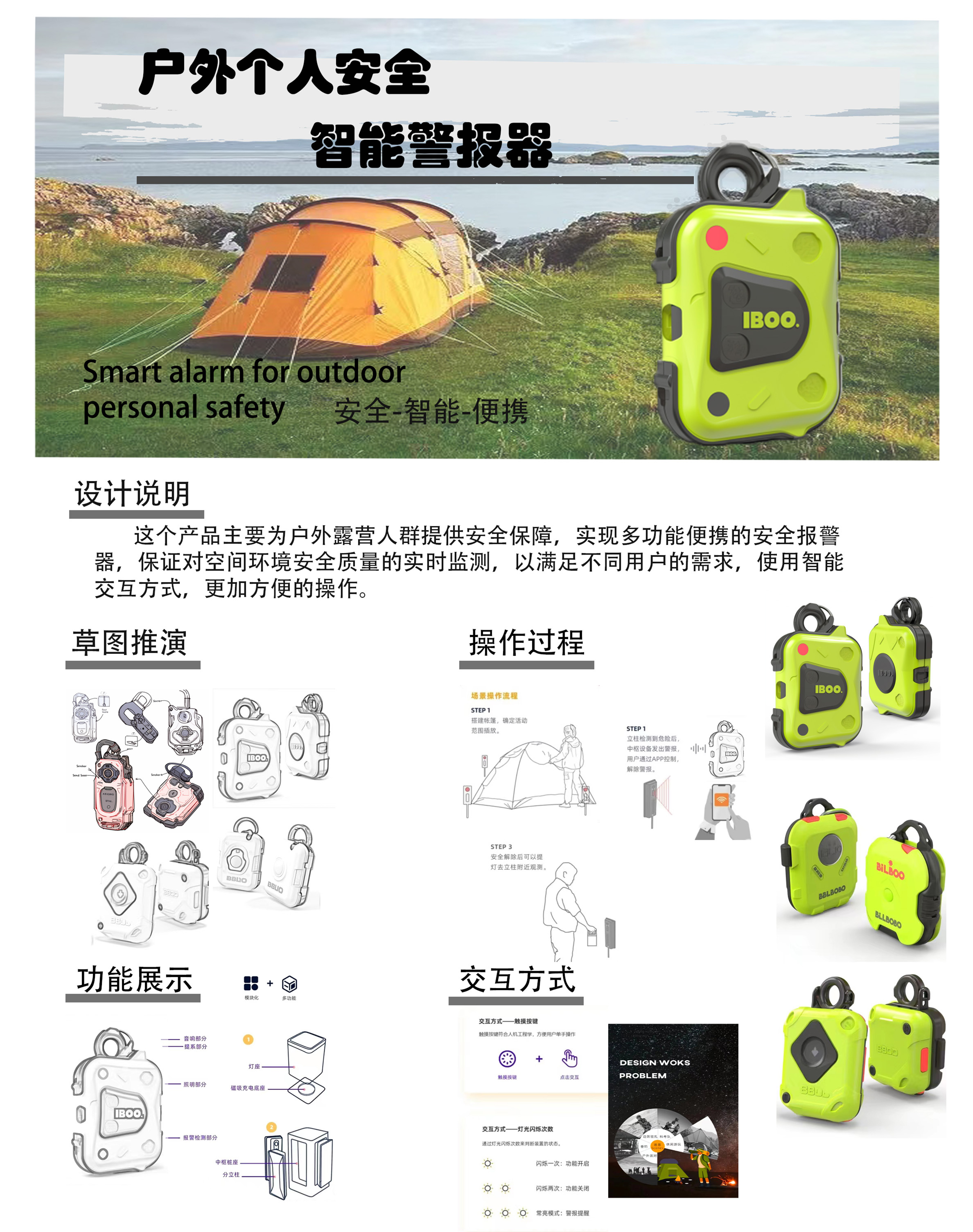 这个产品主要为户外露营人群提供安全保障,实现多功能便携的安全报警器,保证对空间环境安全质量的实时监测,进行人性化的调整,以满足不同用户的需求;使用智能便携的交互方式,用户可以很方便地进行操作,它革新了交互方式以及整体的设计语言。