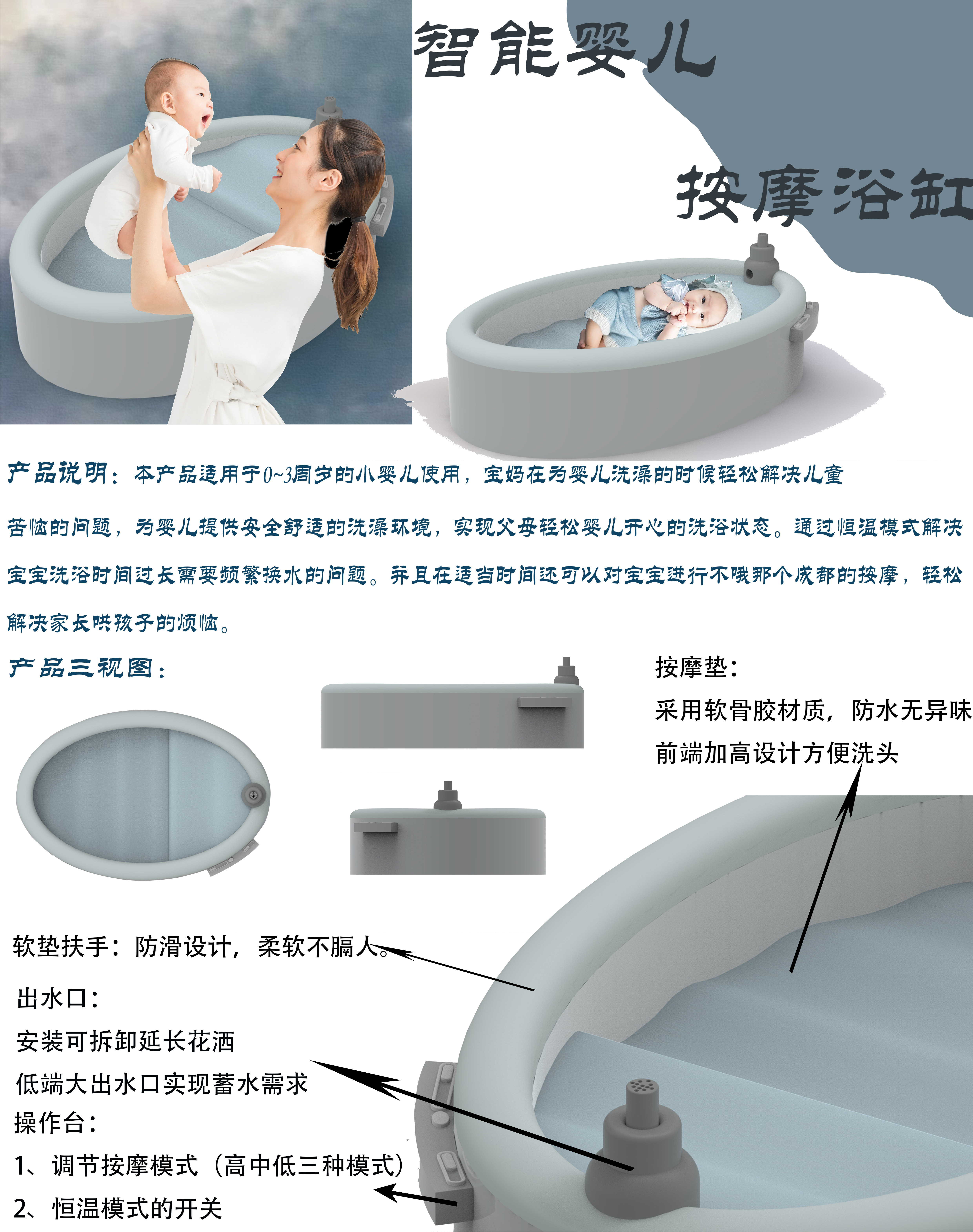 智能婴儿浴缸:带有高中低三种按摩模式,不仅仅能为婴儿停工舒适的洗浴环境,在婴儿长大之后还可以为大人所用来泡脚,并且其恒温模式方便父母洗澡时不用频繁换水。