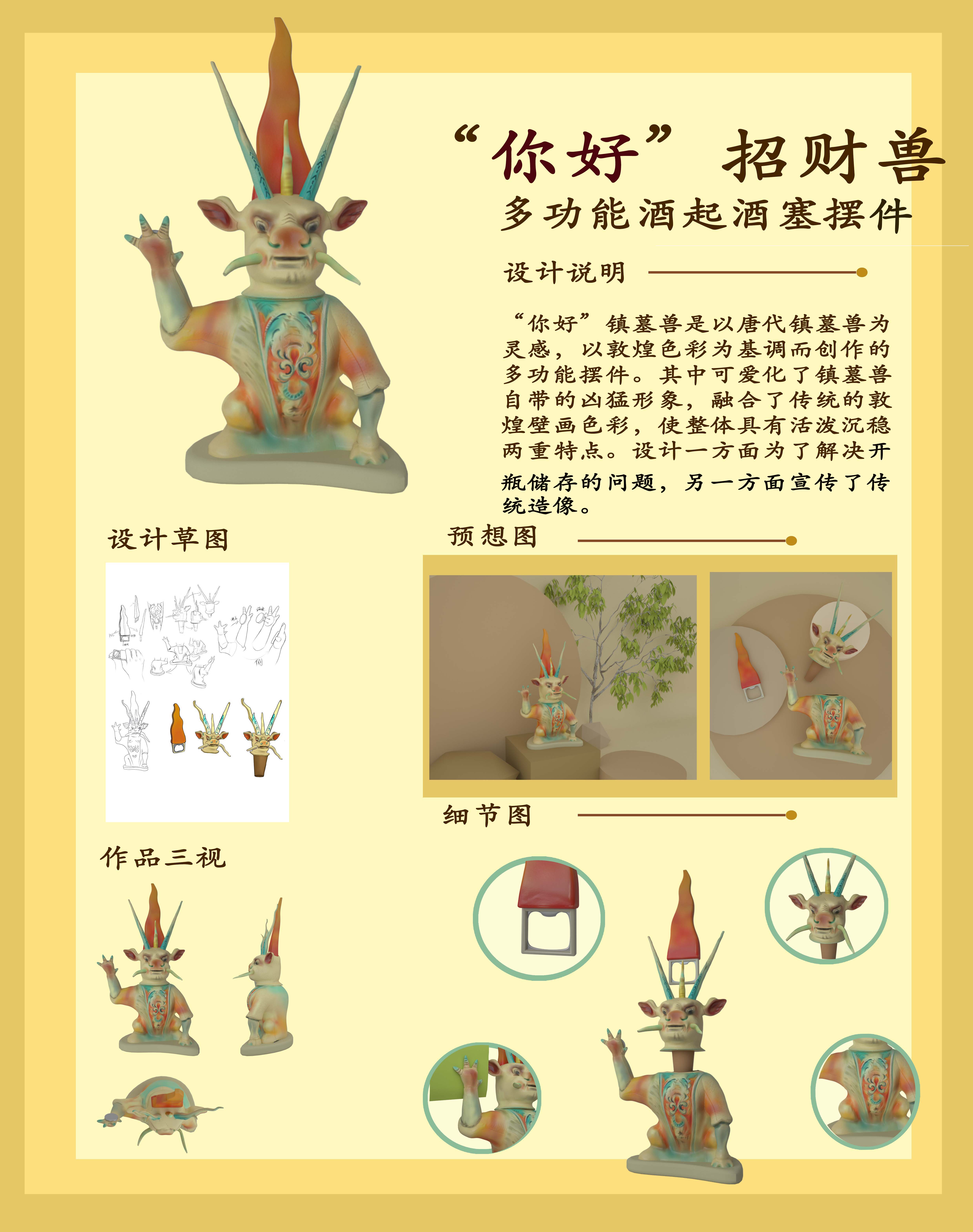 “你好”招财兽是以唐代镇墓兽为灵感,以敦煌色彩为基调而创作的多功能摆件。其中可爱化了镇墓兽自带的凶猛形象,融合了传统的敦煌壁画色彩,使整体具有活泼沉稳两重特点。设计一方面为了解决开瓶储存的问题,另一方面宣传了传统造像。相对于传统的开瓶器和瓶塞来说,它还可以被收纳,避免了收纳难,易丢等问题。