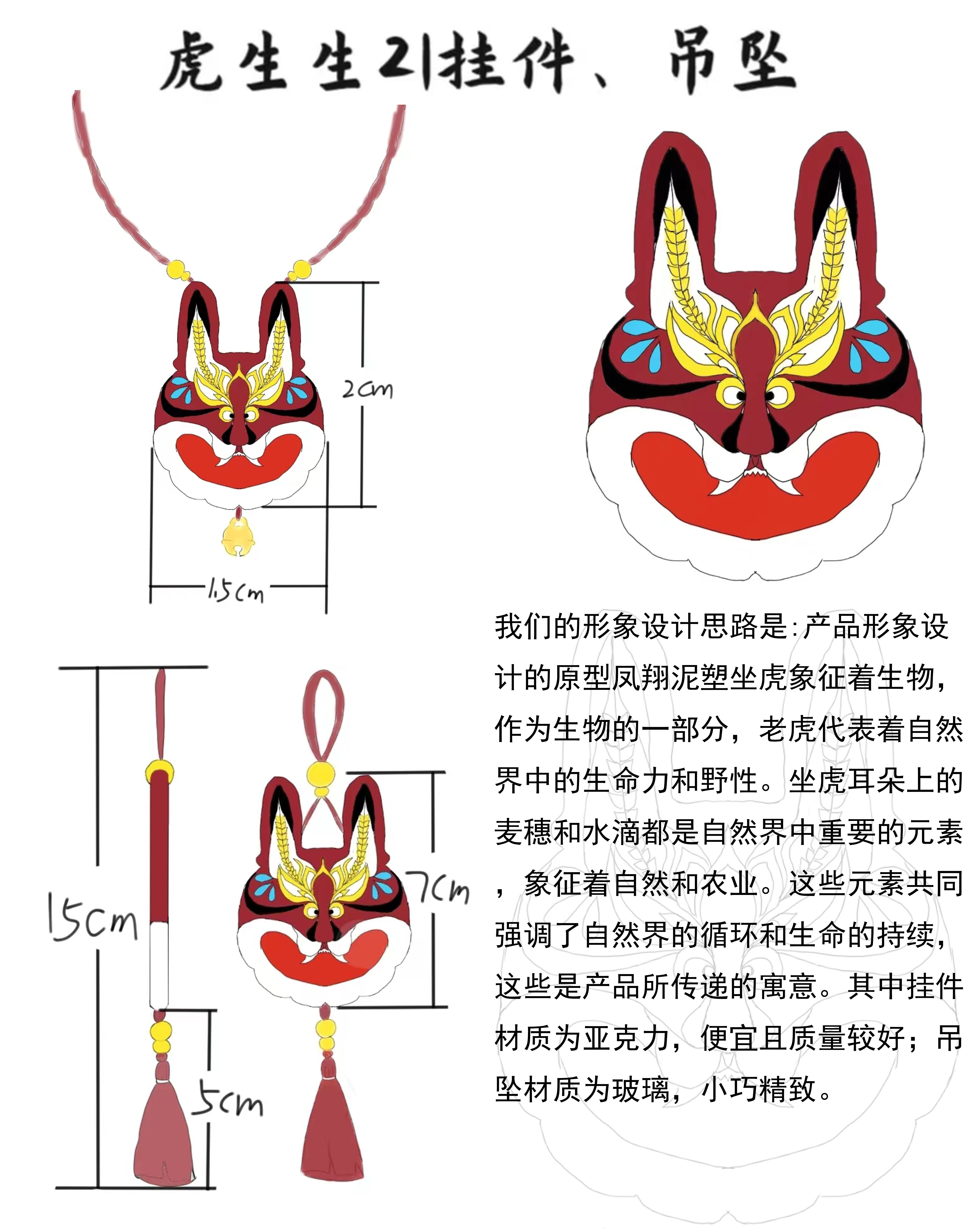 形象设计思路:产品形象设计的原型凤翔泥塑坐虎象征着生物,作为生物的一部分,老虎代表着自然界中的生命力和野性。坐虎耳朵上的麦穗和水滴都是自然界中重要的元素,象征着自然和农业。这些元素共同强调了自然界的循环和生命的持续,这些是产品所传递的寓意。其中挂件材质为亚克力,便宜且质量较好;吊坠材质为玻璃,小巧精致。