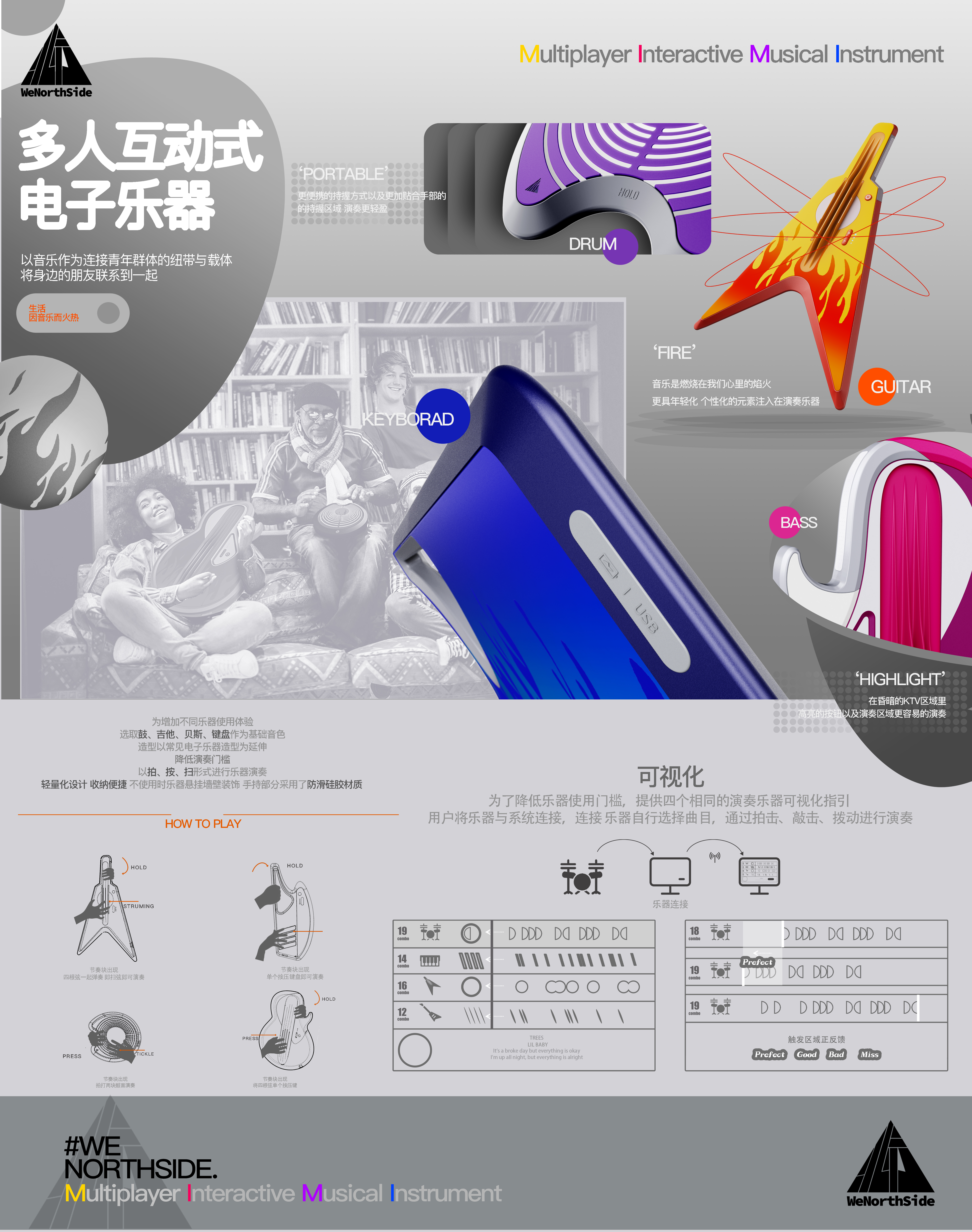 多人互动式电子乐器以音乐作为连接青年群体的纽带与载体将身边的朋友联系到一起,为了降低乐器使用门槛,提供四个相同的演奏乐器可视化指引 用户将乐器与系统连接,连接 乐器自行选择曲目,通过拍击、敲击、拨动进行演奏。