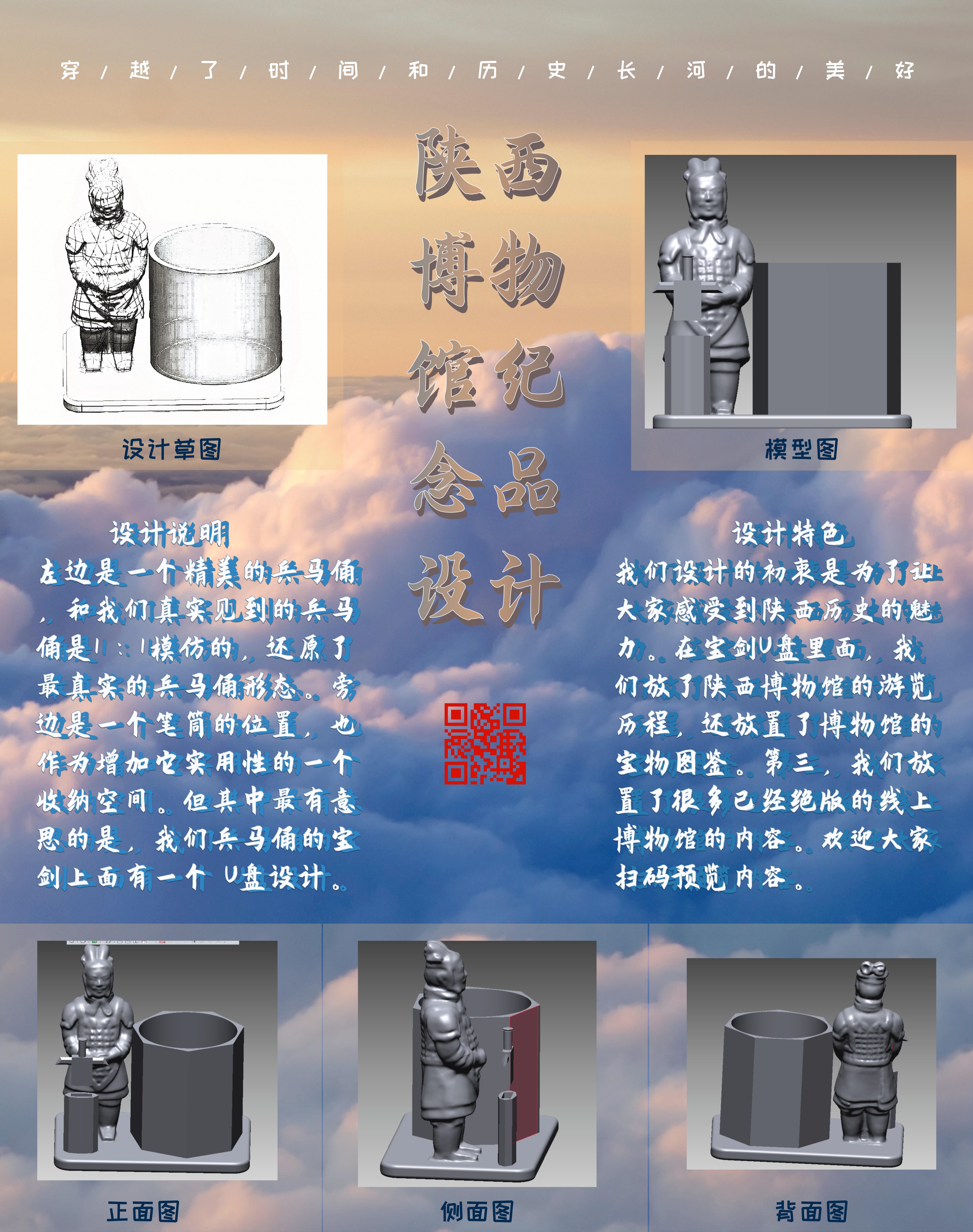 我们将陕西博物馆的兵马俑制成了特别的纪念品,这其中还有U盘的巧妙设计!我们设计的这款陕西博物馆兵马俑纪念品,采用1:1模仿真实兵马俑的形态,高度还原了最真实的兵马俑形态。同时,为了增加其实用性,旁边设计有一个笔筒的位置,方便收纳。U盘里面藏了陕西博物馆的游览历程,我们希望游客回到家后,仍能回味这次旅程。我们设计的初衷就是让每一个从陕西博物馆回到家的人都可以拥有一份特别的纪念品和美好的回忆。