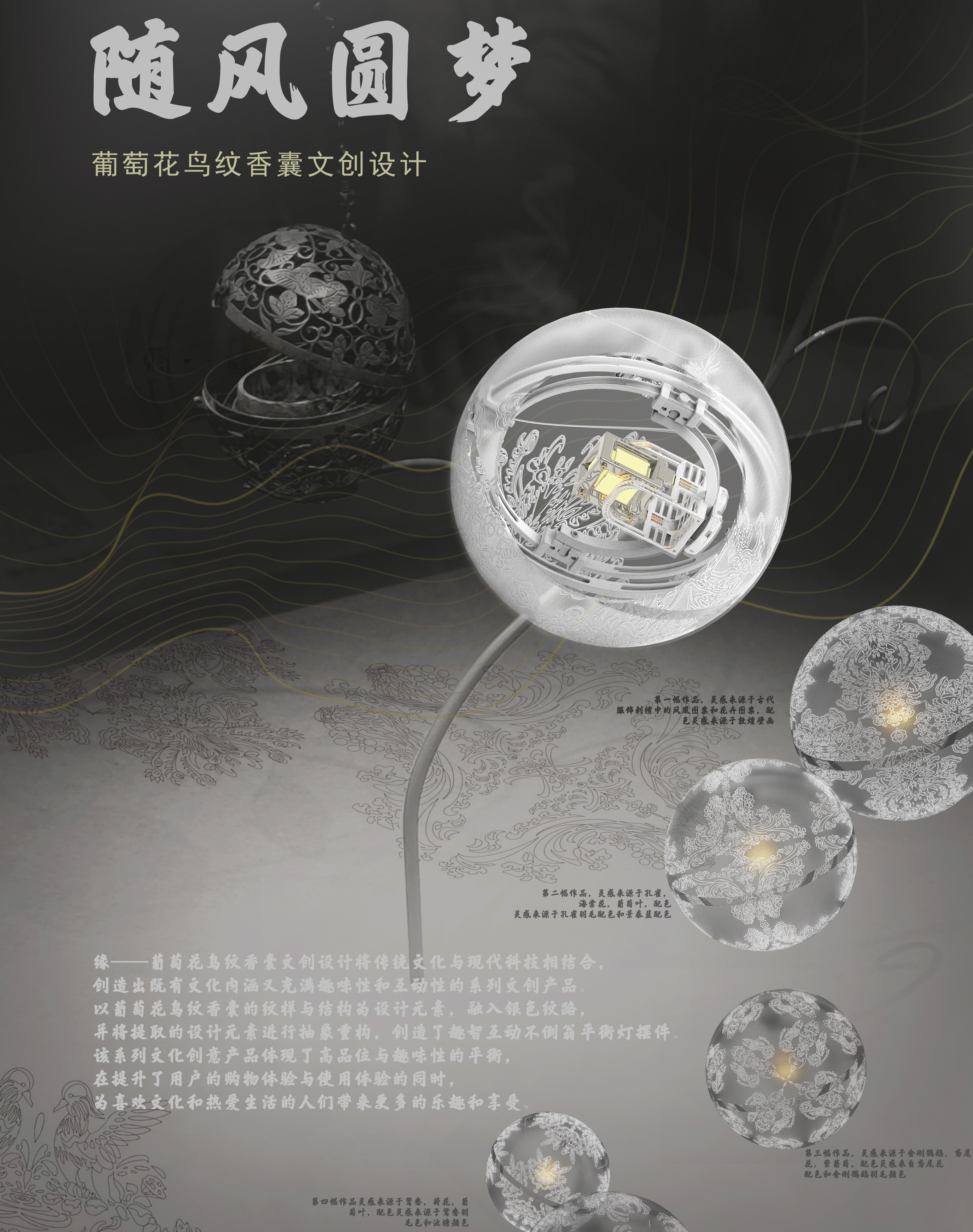 随风圆梦-葡萄花乌纹香囊文创设计将传统文化与现代科技相结合创造出既有文化内涵又充满趣味性和互动性的系列文创产品以葡萄花乌纹香囊的纹样与结构为设计元素,融入银色纹路并将提取的设计元素进行抽象重构,创造了趣智互动不倒翁平衡灯摆件该系列文化创意产品体现了高品位与趣味性的平衡,在提升了用户的购物体验与使用体验的同时。为喜欢文化和热爱生活的人们带来更多的乐趣和享受。