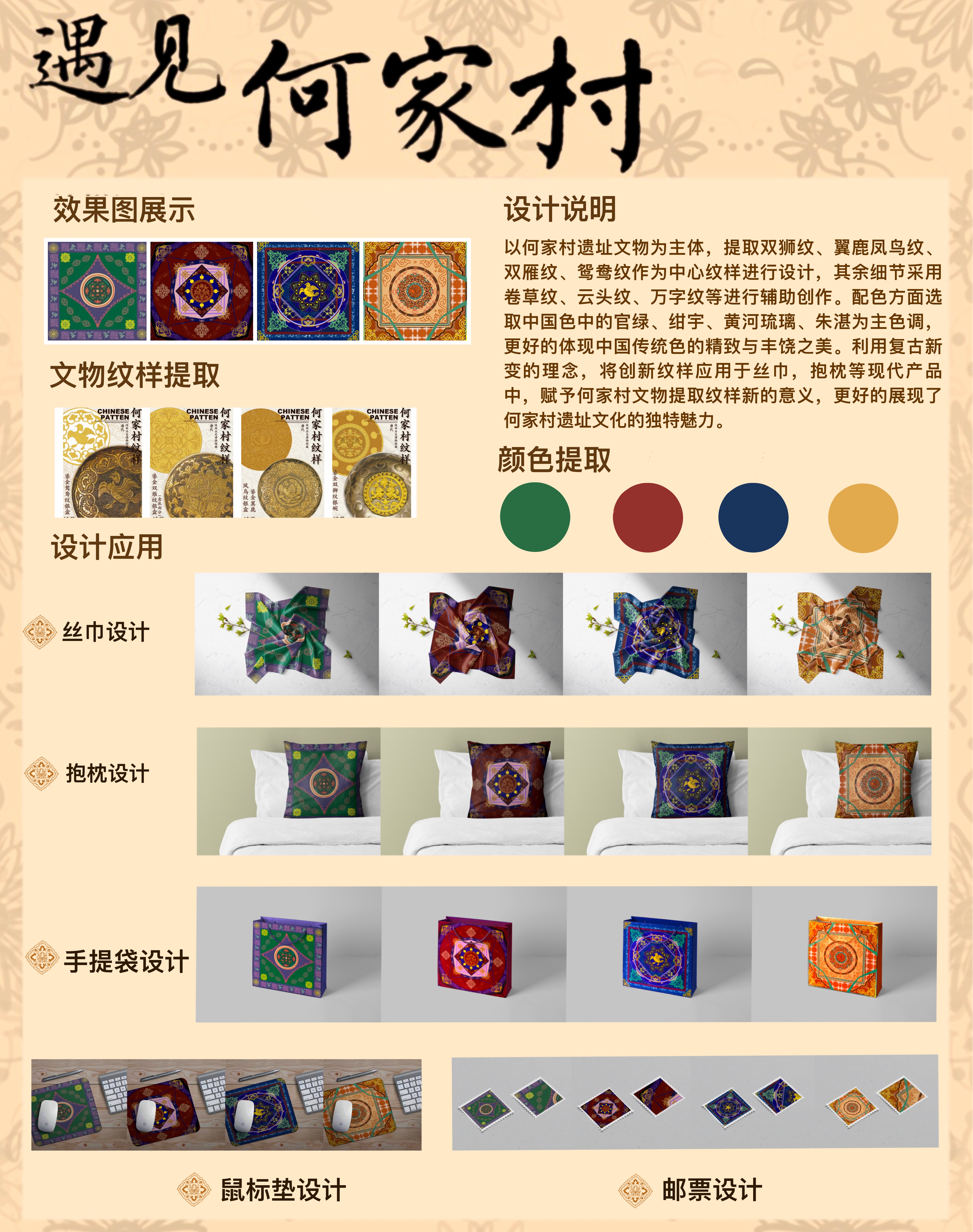 以何家村遗址文物为主体,提取双狮纹、翼鹿凤鸟纹、双雁纹、鸳鸯纹作为中心纹样进行创作。其余细节采用卷草纹、云头纹、万字纹等进行辅助创作。配色方面选取中国色中的官绿、绀宇、黄河琉璃、朱湛为主色调,更好的体现中国传统色的精致与丰饶之美。利用复古新变的理念,将纹样设计应用于丝巾,抱枕等现代产品中,赋予何家村纹样新的意义,更好的展现了何家村遗址文化的独特魅力。