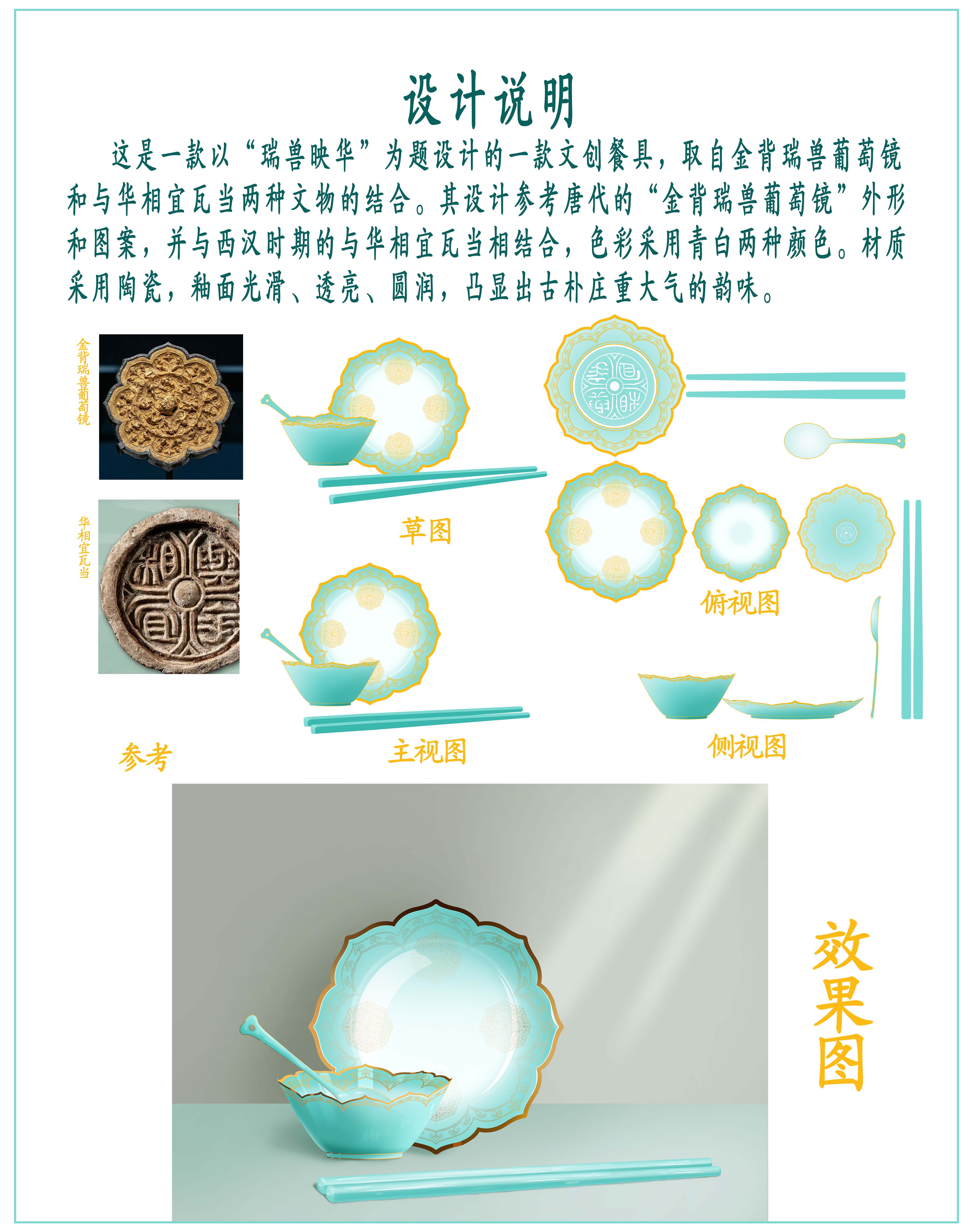 这是一款以“瑞兽映华”为题设计的一款文创餐具,取自金背瑞兽葡萄镜和与华相宜瓦当两种文物的结合。其设计参考唐代的“金背瑞兽葡萄镜”外形和图案,并与西汉时期的与华相宜瓦当相结合,色彩采用青白两种颜色。材质采用陶瓷,釉面光滑、透亮、圆润,凸显出古朴庄重大气的韵味。