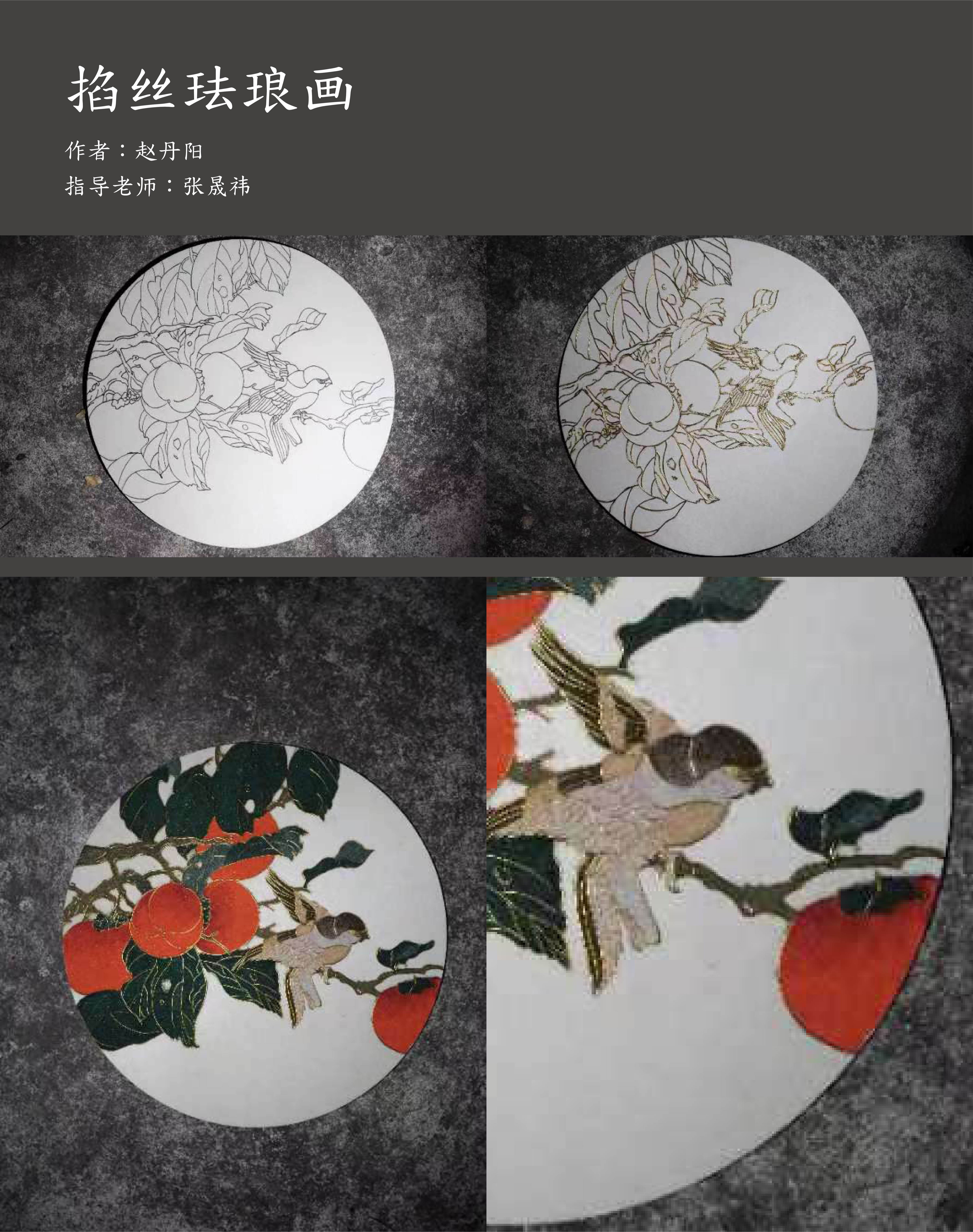 掐丝珐琅画是一种将珐琅附着在铜胎上烧制器物的传统工艺,掐丝珐琅运用简单的曲线,表达自然场景,利用金属丝的虚实将场景的空间表达出来,该传统工艺融合了国画,油画,白描等纯画技术,在这幅作品中我运用了传统非遗与中国国画的相结合,带来现代与古典的碰撞,弘扬传统文化任重而道远。