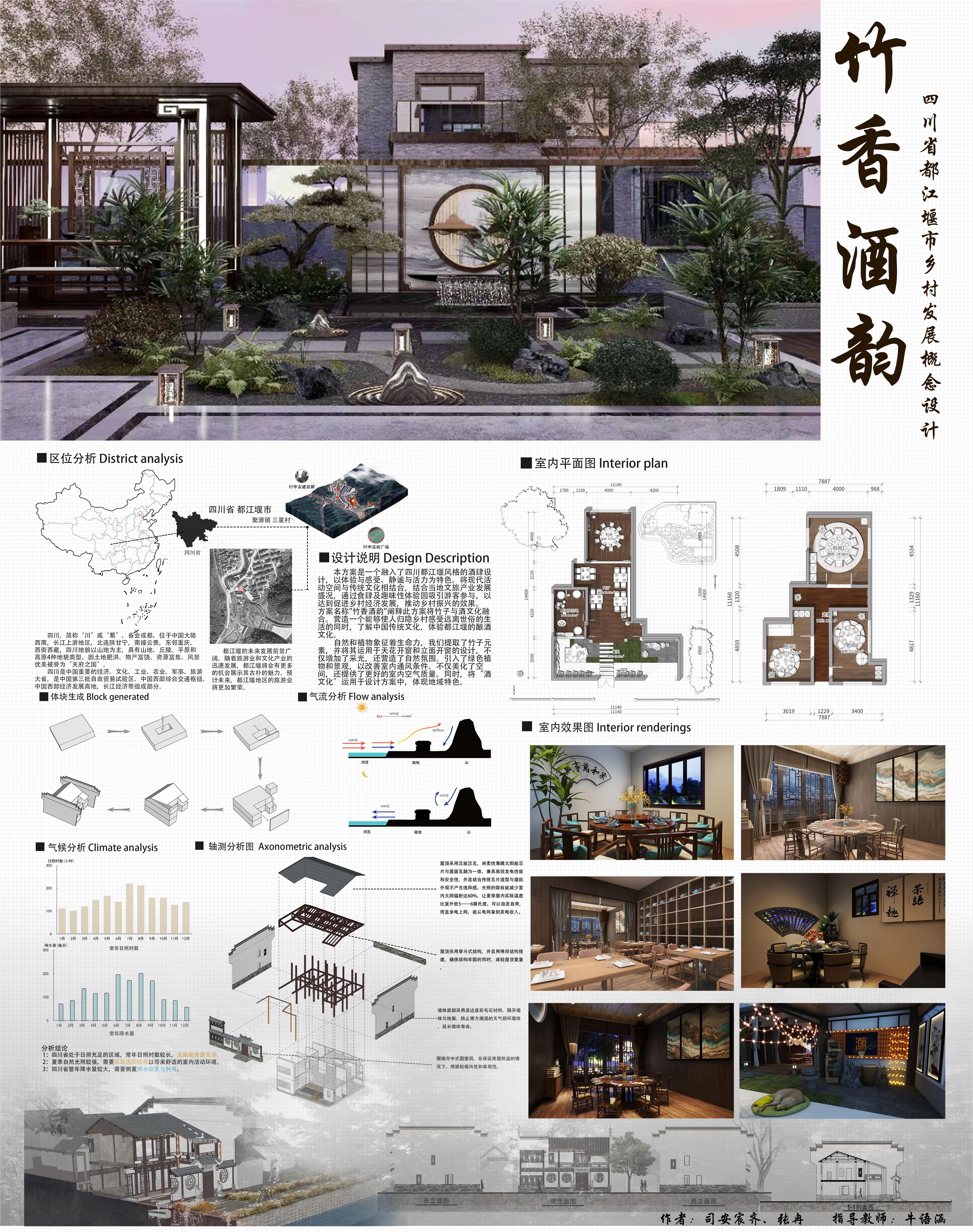 本方案是一个酒肆设计,以体验与感受、静谧与活力为特色。将现代活动空间与传统文化相结合,方案名称"竹香酒韵",阐释此方案将竹子与酒文化融合。使人在有归隐乡林,远离世俗的生活感受的同时,了解中国传统文化,体验酿酒文化。结合当地文旅产业发展盛况,通过食肆及趣味性体验吸引游客参与,以达到促进乡村经济发展,推动乡村振兴的效果。