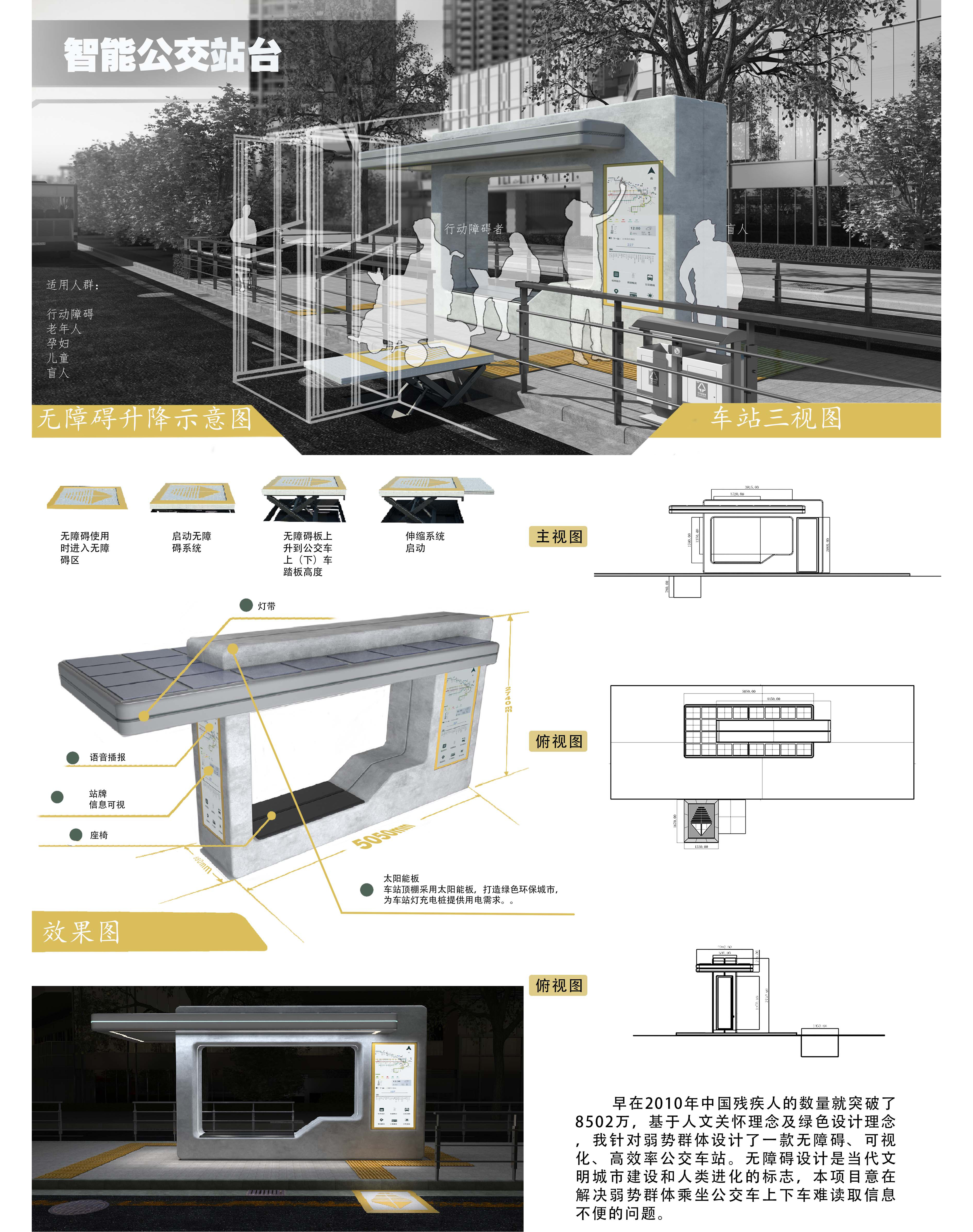 早在2010年中国残疾人的数量就突破了8502万,基于人文关怀理念及绿色设计理念,我针对弱势群体设计了一款无障碍、可视化、高效率公交车站。无障碍设计是当代文明城市建设和人类进化的标志,本项目意在解决弱势群体乘坐公交车上下车难读取信息不便的问题。