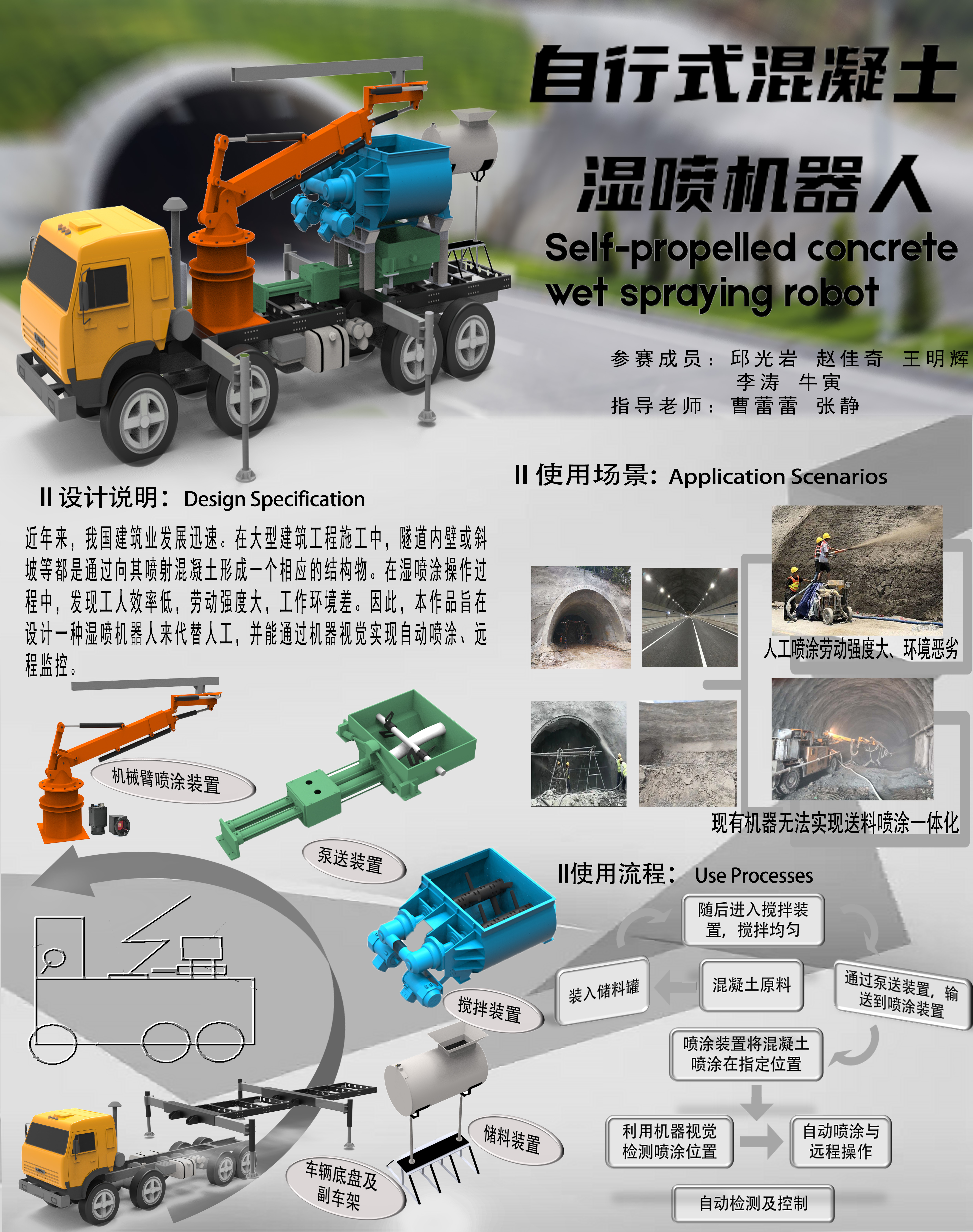 近年来,我国建筑业发展迅速。在大型建筑工程施工中,隧道内壁、斜坡等一般都是通过向其喷射混凝土并形成一个相应的结构物。在湿喷涂操作过程中,发现工人效率低,强度大,工作环境差。因此,机器人被用来代替人工的混凝土喷涂操作。但现有设备无法实现混凝土储存、搅拌、输送、喷涂一体化运行。本作品旨在设计一种一体化湿喷机器人来完成工作,并能通过机器视觉实现自动喷涂、远程监控。