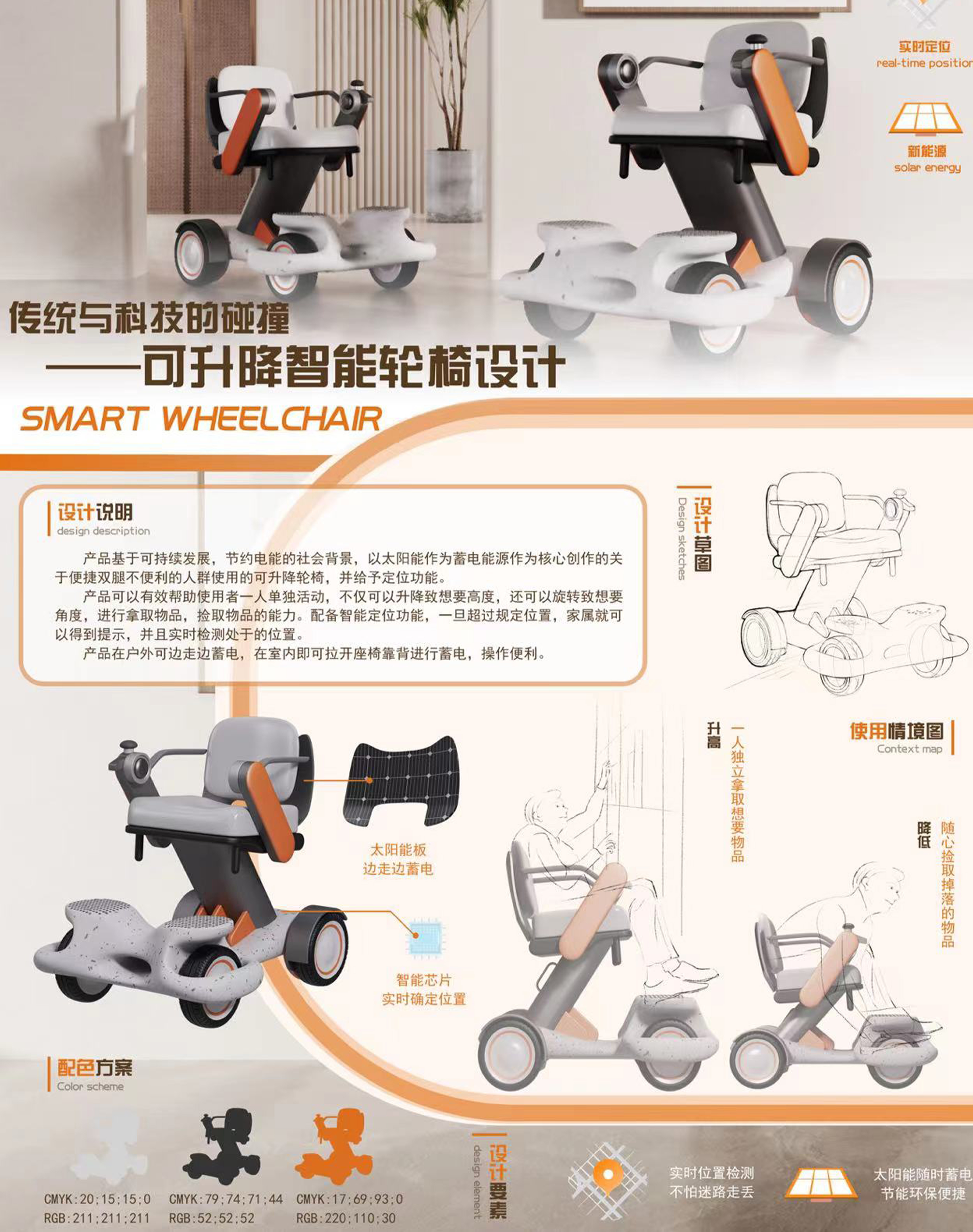 产品基于可持续发展,节约电能的社会背景,以太阳能作为蓄电能源作为核心创作的关于便捷双腿不便利的人群使用的可升降轮椅,并给予定位功能。产品可以有效帮助使用者一人单独活动,不仅可以升降致想要高度,还可以旋转致想要角度,进行拿取物品,捡取物品的能力。配备智能定位功能,一旦超过规定位置,家属就可以得到提示,并且实时检测处于的位置。产品在户外可边走边蓄电,在室内即可拉开座椅靠背进行蓄电,操作便利。