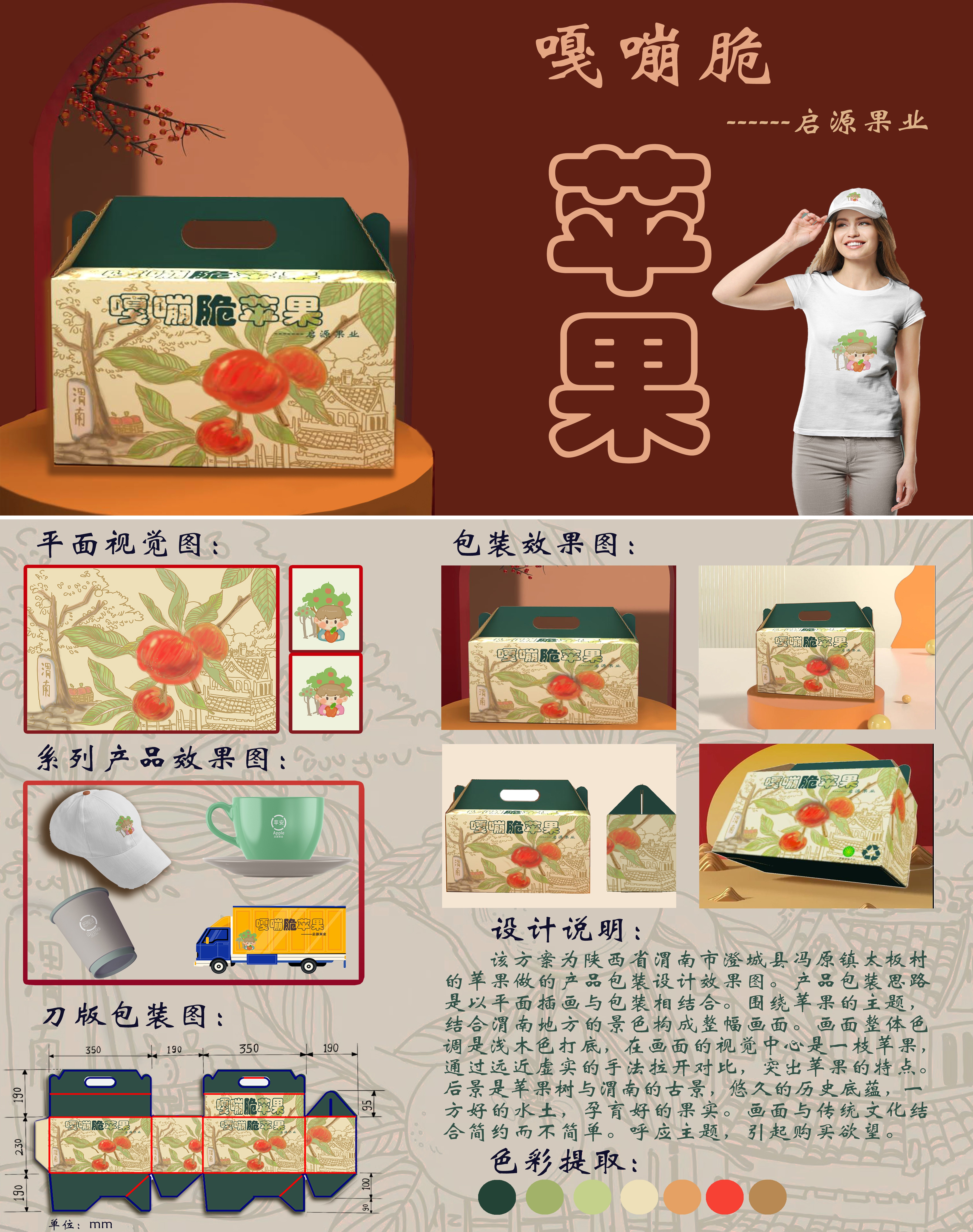 该方案为陕西省渭南市澄城县冯原镇太板村的苹果做的产品包装设计效果图。产品包装思路是以平面插画与包装相结合。围绕苹果的主题结合渭南地方的景色构成整幅画面。画面整体色调是以浅木色打底,在画面的视觉中心是一枚苹果,通过远近虚实的手法拉开对比,突出苹果的特点。后劲的是苹果树与渭南的古景,悠久的历史底蕴,一方好的水土,孕育好的果实。画面与传统文化结合简约而不简单。呼应主题,引起购买欲望。