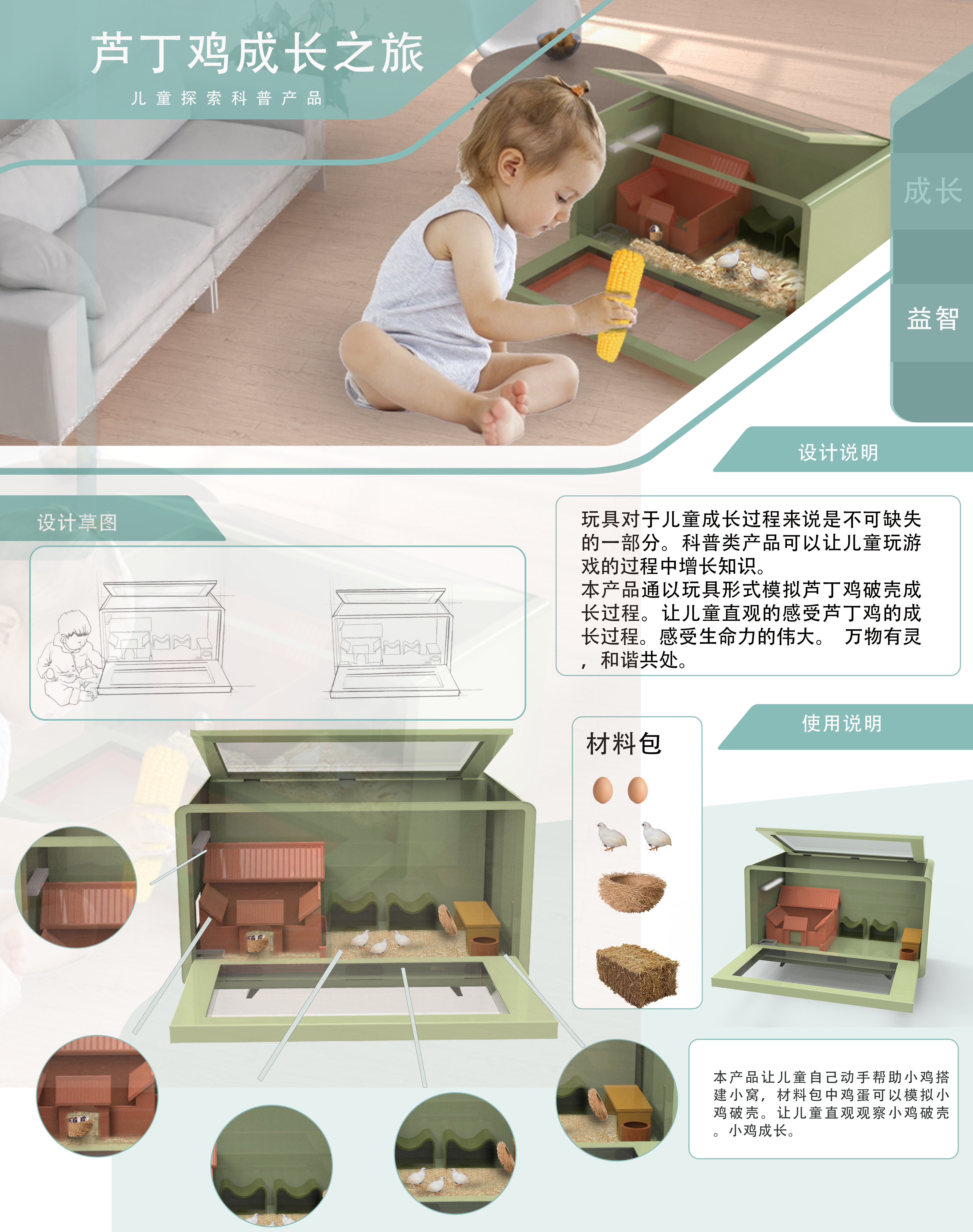 玩具对于儿童成长过程来说是不可缺失的一部分。科普类产品可以让儿童玩游戏的过程中增长知识。本产品通以玩具形式模拟芦丁鸡破壳成长过程。让儿童直观的感受芦丁鸡的成长过程。感受生命力的伟大。 万物有灵,和谐共处。本产品让儿童自己动手帮助小鸡搭建小窝,材料包中鸡蛋可以模拟小鸡破壳。让儿童直观观察小鸡破壳,小鸡成长。