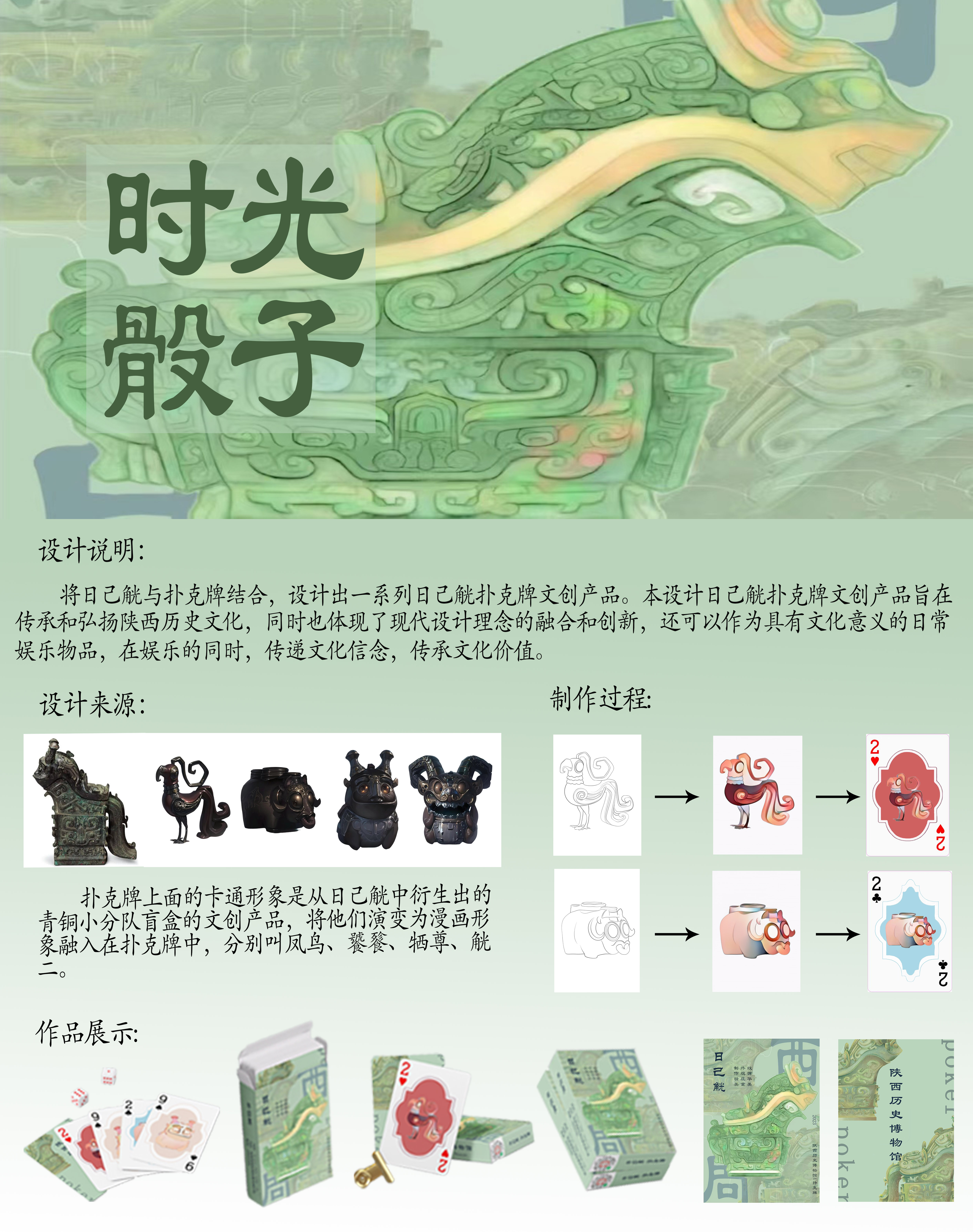 觥是西周之际众多酒器中造型特殊的一种盛酒兼饮酒器。作品将日已觥与扑克牌结合,设计出一系列日己觥扑克牌文创产品。 本设计日己觥扑克牌文创产品旨在传承和弘扬陕西历史文化,同时也体现了现代设计理念的融合和创新,还可以作为具有文化意义的日常娱乐物品,在娱乐的同时,传递文化信念,传承文化价值。 时光骰子既体现了日己觥的历史文化内涵,又包含了扑克牌的娱乐元素,意味着产品将带给融入历史与休闲的体验。