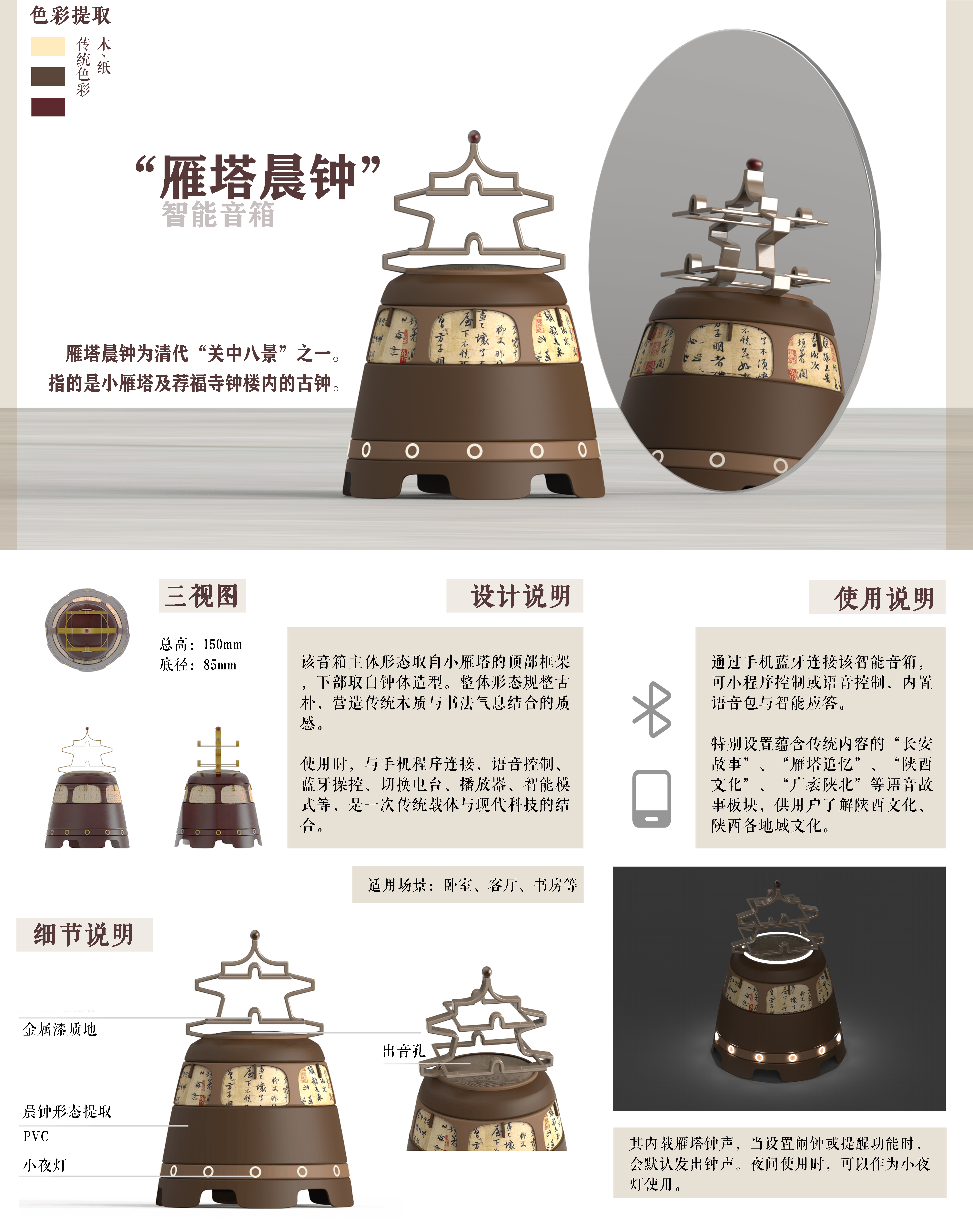 该音箱主体形态取自小雁塔的顶部框架,下部取自钟体造型。整体形态规整古朴,营造传统木质与书法气息结合的质感。使用时,与手机程序连接,语音控制、蓝牙操控、切换电台、播放器、智能模式等,是一次传统载体与现代科技的结合。