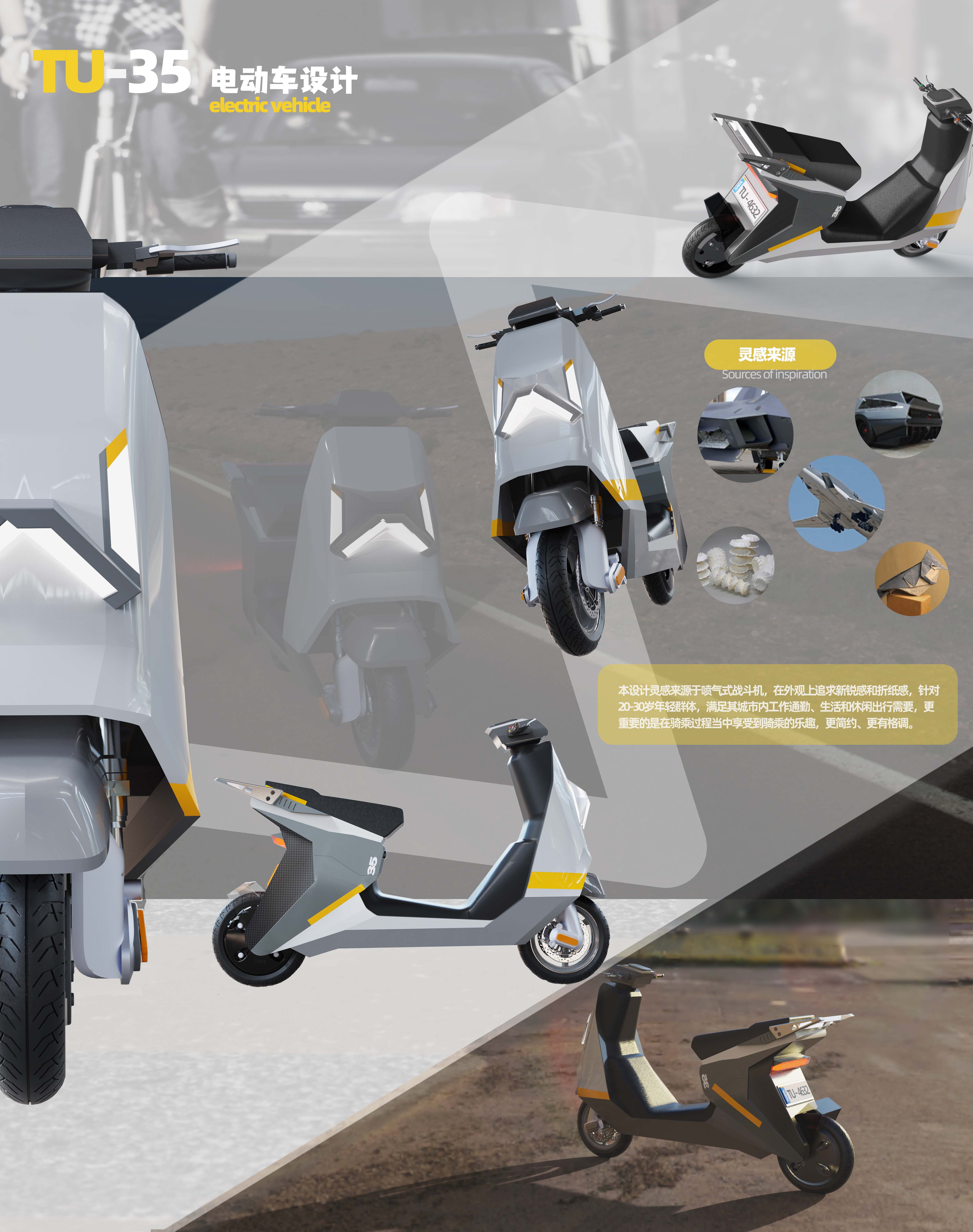 本设计灵感来源于喷气式战斗机,在外观上追求新锐感和折纸感,针对20-30岁年轻群体满足其城市内工作通勤、生活和休闲出行需要更重要的是在骑乘过程当中享受到骑乘的乐趣,更简约、更有格调。将喷气式战斗机侧翼的折线感同时融入科技和时尚,赋予独特设计语言。外观和整体印象保持紧密度,将骑行乐趣、精简风格紧密结合在一起。