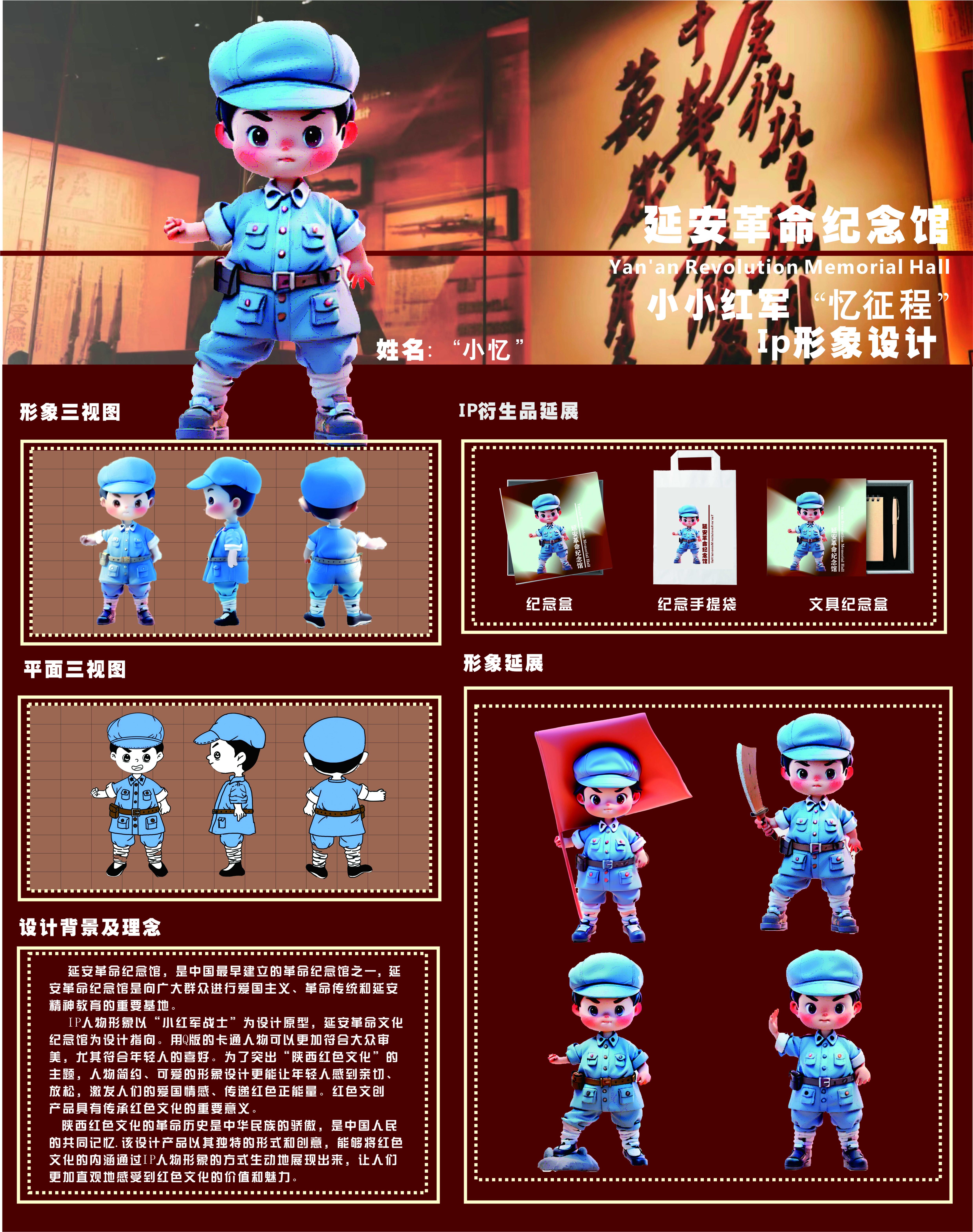 IP人物形象以”小红军战士“为设计原型,延安革命文化纪念馆为设计指向。用Q版的卡通形象可以更加符合年轻人的喜好。为了突出“陕西红色文化”的主题,人物简约、可爱,可以激发人们的爱国精神、传递红色正能量。红色文化创意产品具有传承红色文化的重要意义。陕西红色文化的革命历史是中华民族的骄傲,是中国人的共同记忆,以IP形象的方式将红色文化的意义及内涵生动的展现,让人们更加直观的感受到红色文化的价值和魅力。