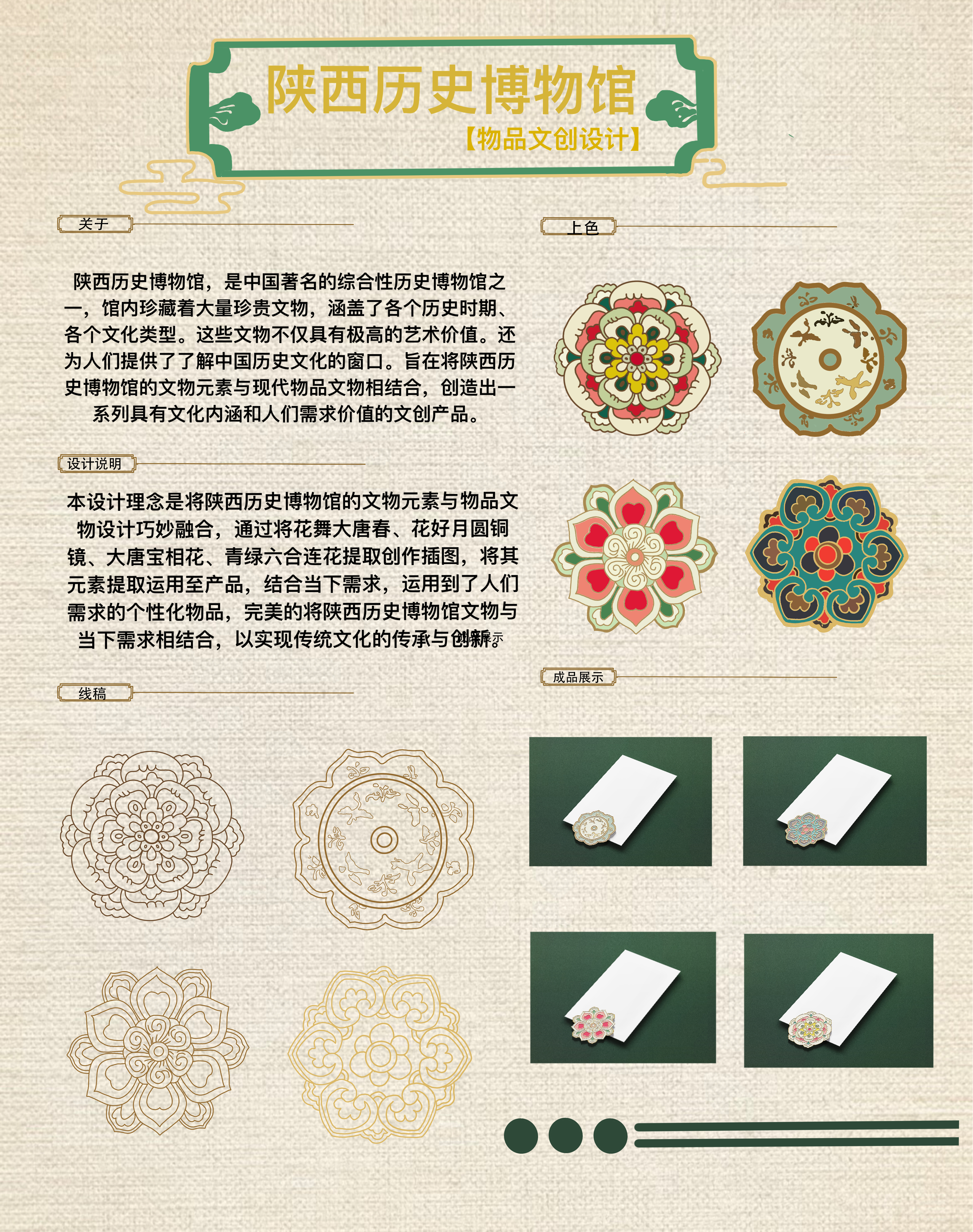 本设计理念是将陕西历史博物馆的文物元素与物品文物设计巧妙融合,通过将花舞大唐春、花好月圆铜镜、大唐宝相花、青绿六合连花提取创作插图,将其元素提取运用至产品,结合当下需求,运用到了人们需求的个性化物品,完美的将陕西历史博物馆文物与当下需求相结合,以实现传统文化的传承与创新。