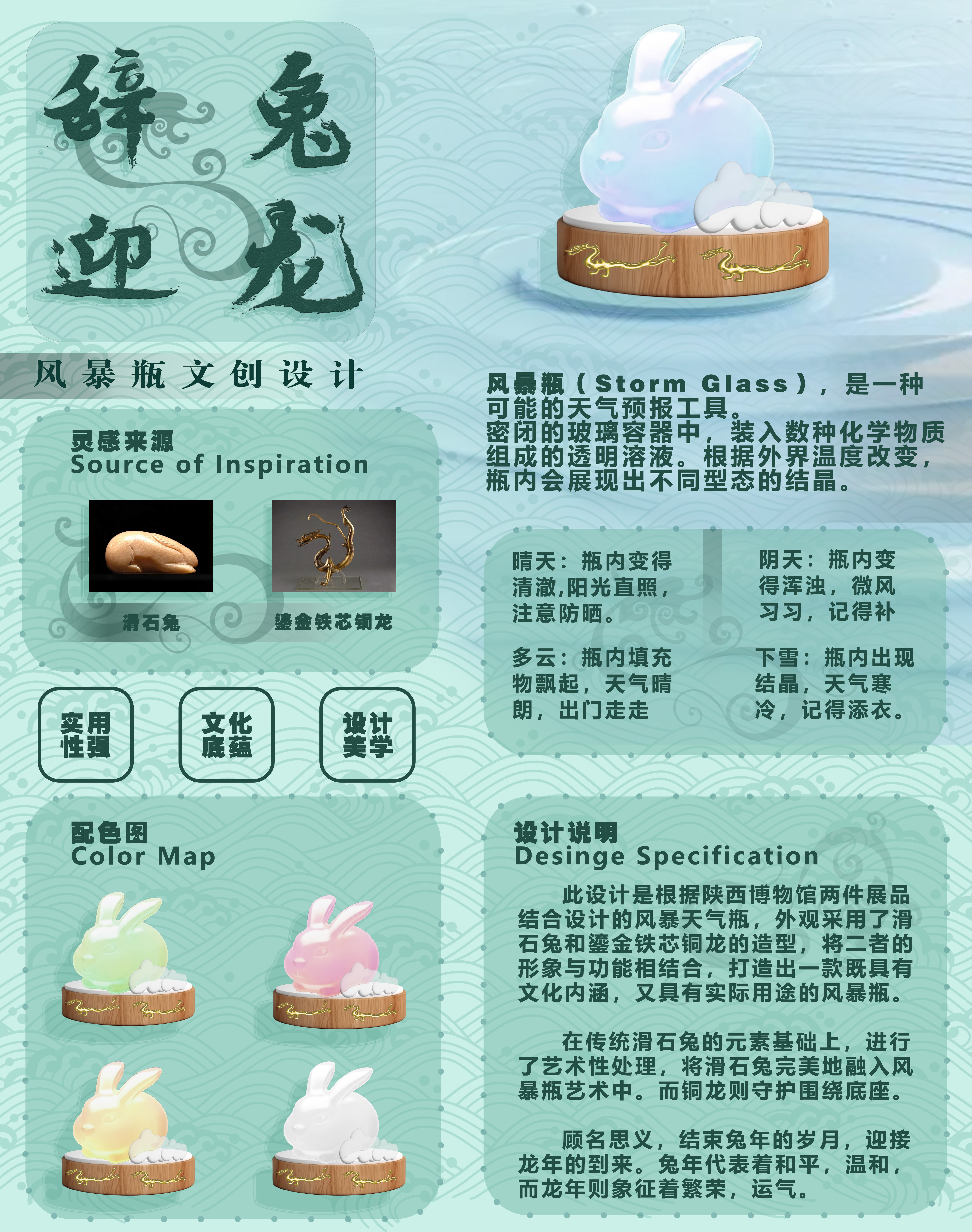 此设计是根据陕西博物馆两件展品结合设计的风暴天气瓶,外观采用了滑石兔和鎏金铁芯铜龙的造型,将二者的形象与功能相结合,打造出一款既具有文化内涵,又具有实际用途的风暴瓶。在传统滑石兔的元素基础上,进行了艺术性处理,将滑石兔完美地融入风暴瓶艺术中。而铜龙则守护围绕底座。顾名思义,结束兔年的岁月,迎接龙年的到来。兔年代表着和平,温和,而龙年则象征着繁荣,运气。
