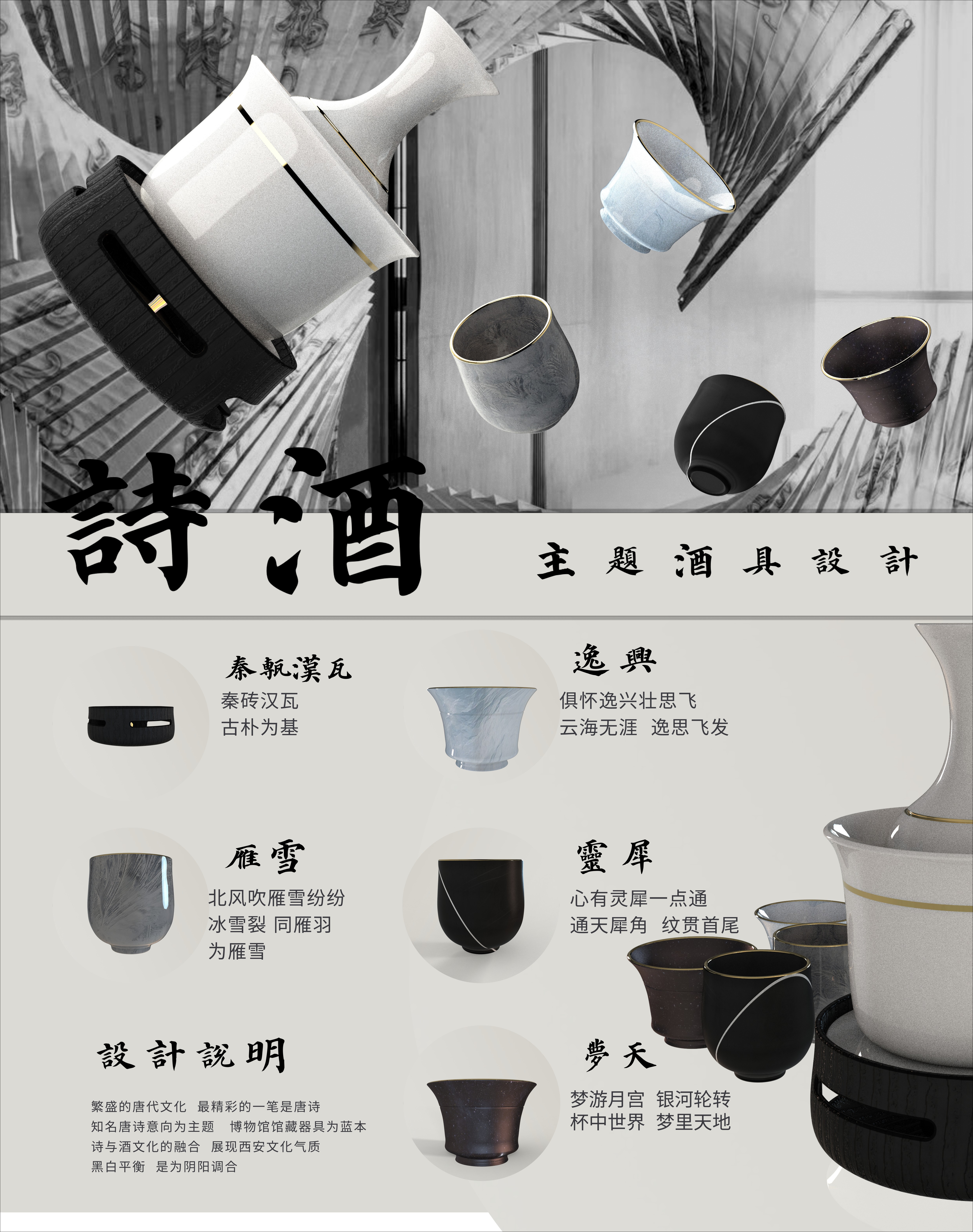 繁盛的唐代文化 最精彩的一笔是唐诗 知名唐诗意向为主题 博物馆馆藏器具为蓝本 诗与酒文化的融合 展现西安文化气质 黑白平衡 是为阴阳调合 秦砖汉瓦,古朴为基 雁雪,北风吹雁雪纷纷,冰雪裂 同雁羽 为雁雪 逸兴,俱怀逸兴壮思飞,云海无涯 逸思飞发 灵犀,心有灵犀一点通,通天犀角 纹贯首尾 梦天,梦游月宫 银河轮转 杯中世界 梦里天地