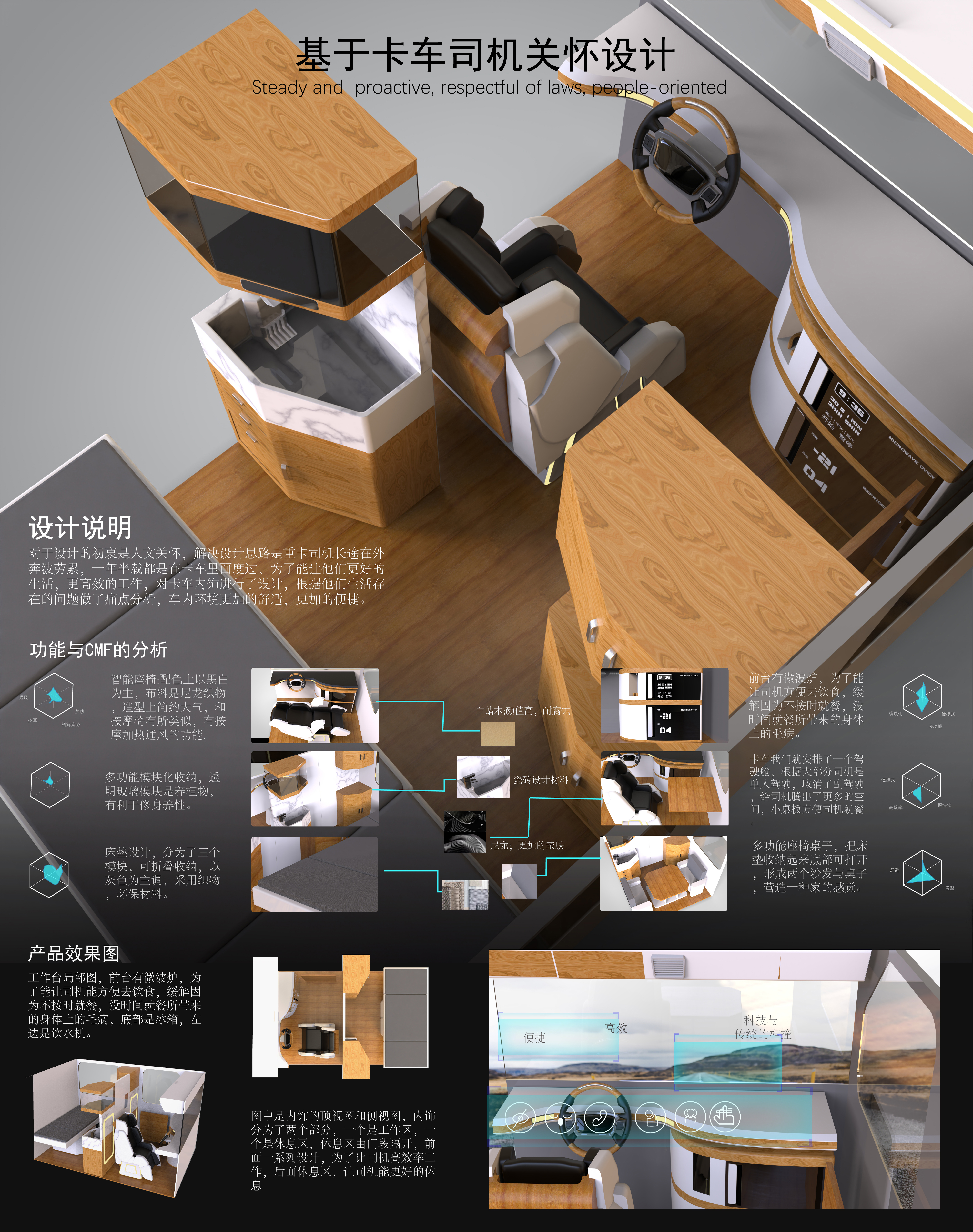对于设计的初衷是人文关怀,解决设计思路是重卡司机长途在外奔波劳累,一年半载都是在卡车里面度过,为了能让他们更好的生活,更高效的工作,对卡车内饰进行了设计,根据他们生活存在的问题做了痛点分析,车内环境更加的舒适,更加的便捷。