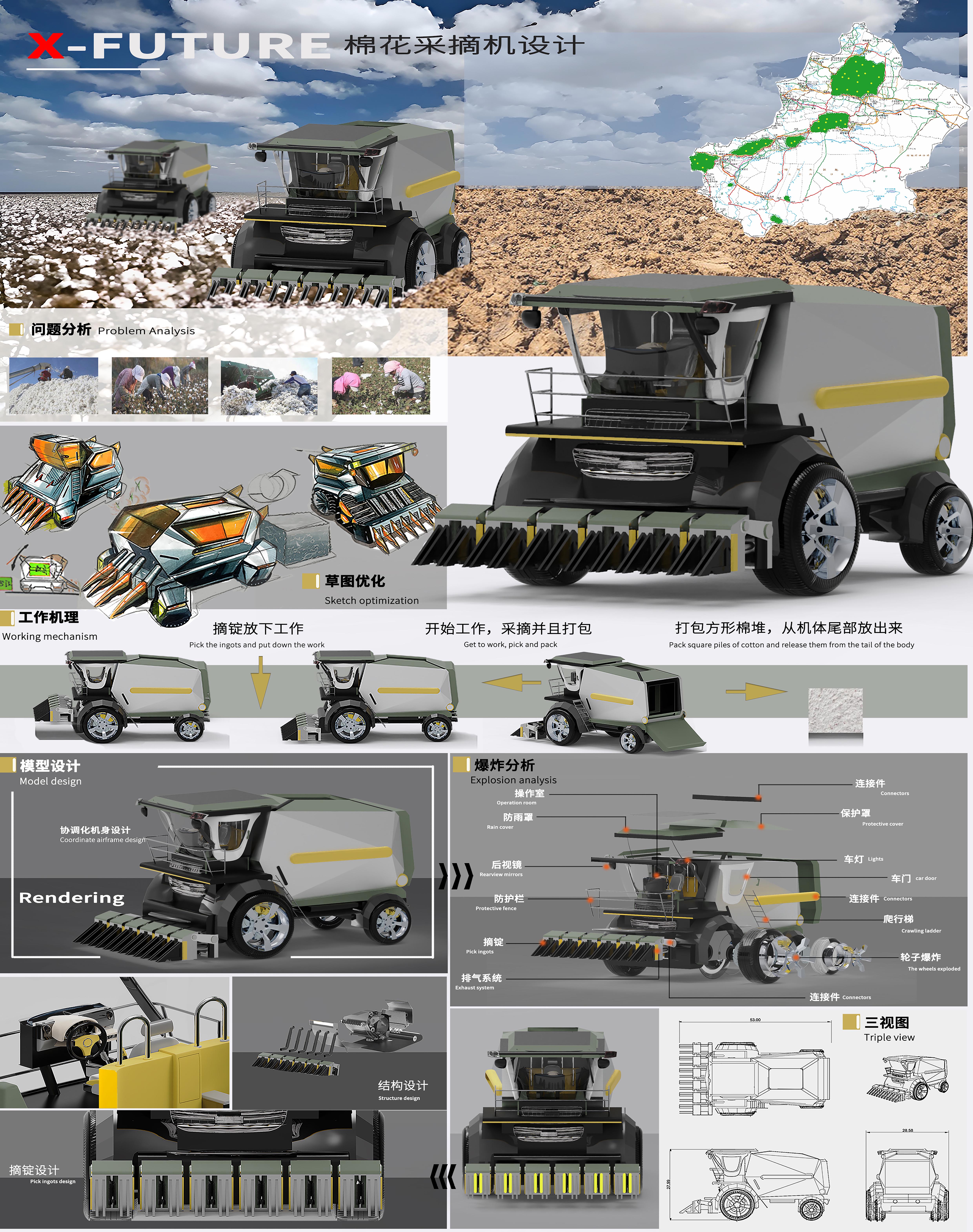 这款产品主要用于棉花种植农户与棉花采摘机之间中间环节,我们将其定义为“中间商”,本设计主要是在现有棉花采摘机的基础上进行改良创新,打造一款适合在我国推广的、具有实用性的新型棉花采摘机。对原有棉花采摘机进行外观造型改造,主要是将原本的圆形打包改为方形打包。通过现有棉花采摘机造型设计,本设计以“方便使用、性能优越、实用性强”为设计思路。结合“人机工程学”和“美学”原理进行设计,对棉花采摘机进行优化升级