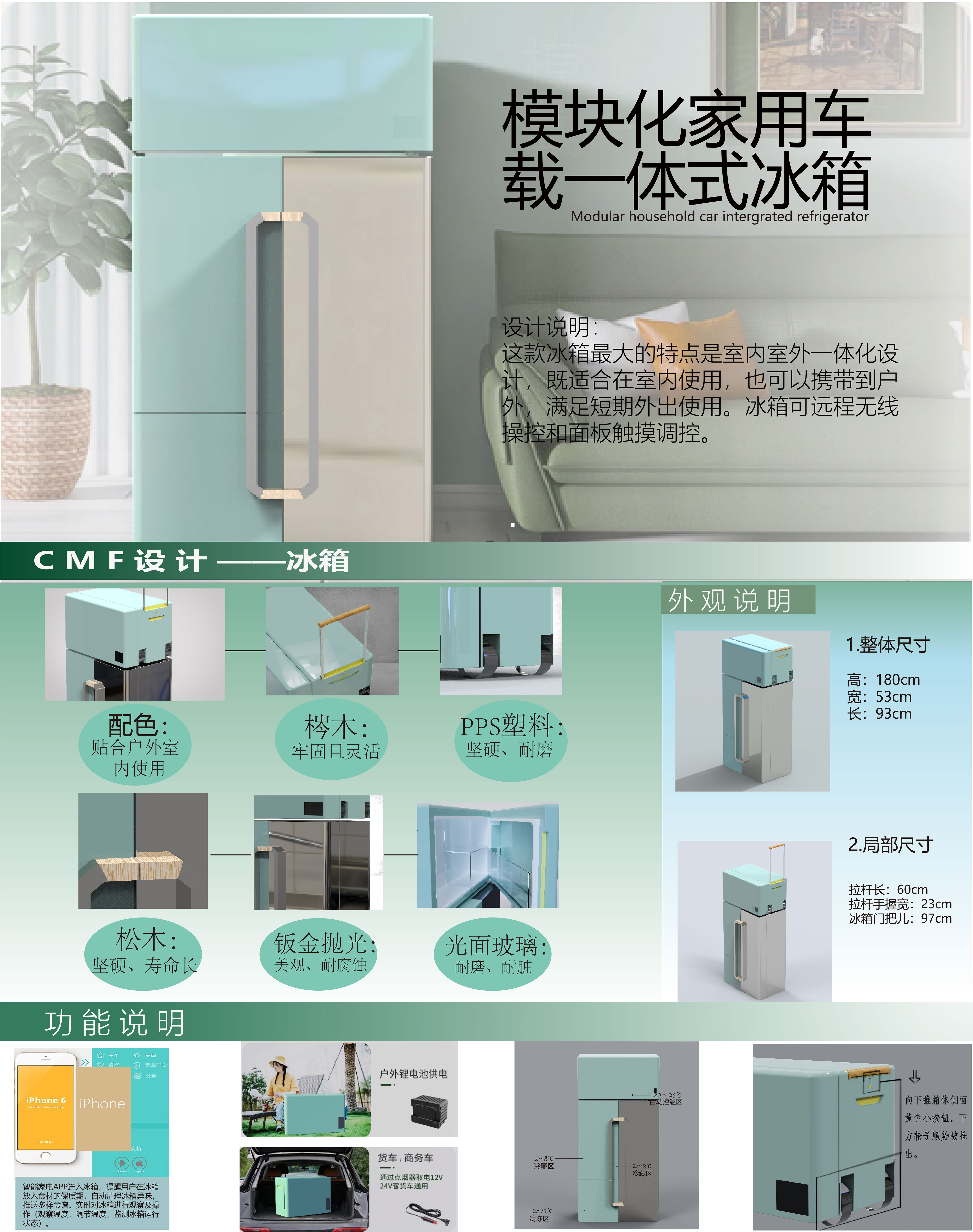 此产品打破了传统冰箱的单一使用场景,采用模块化设计,最大的特点是室内室外一体化设计,这款多功能冰箱既适合在室内使用,也可以把冰箱可拆卸部分携带到户外,满足现代人外出使用的需求,还可以用智能手机对冰箱进行无线操控。