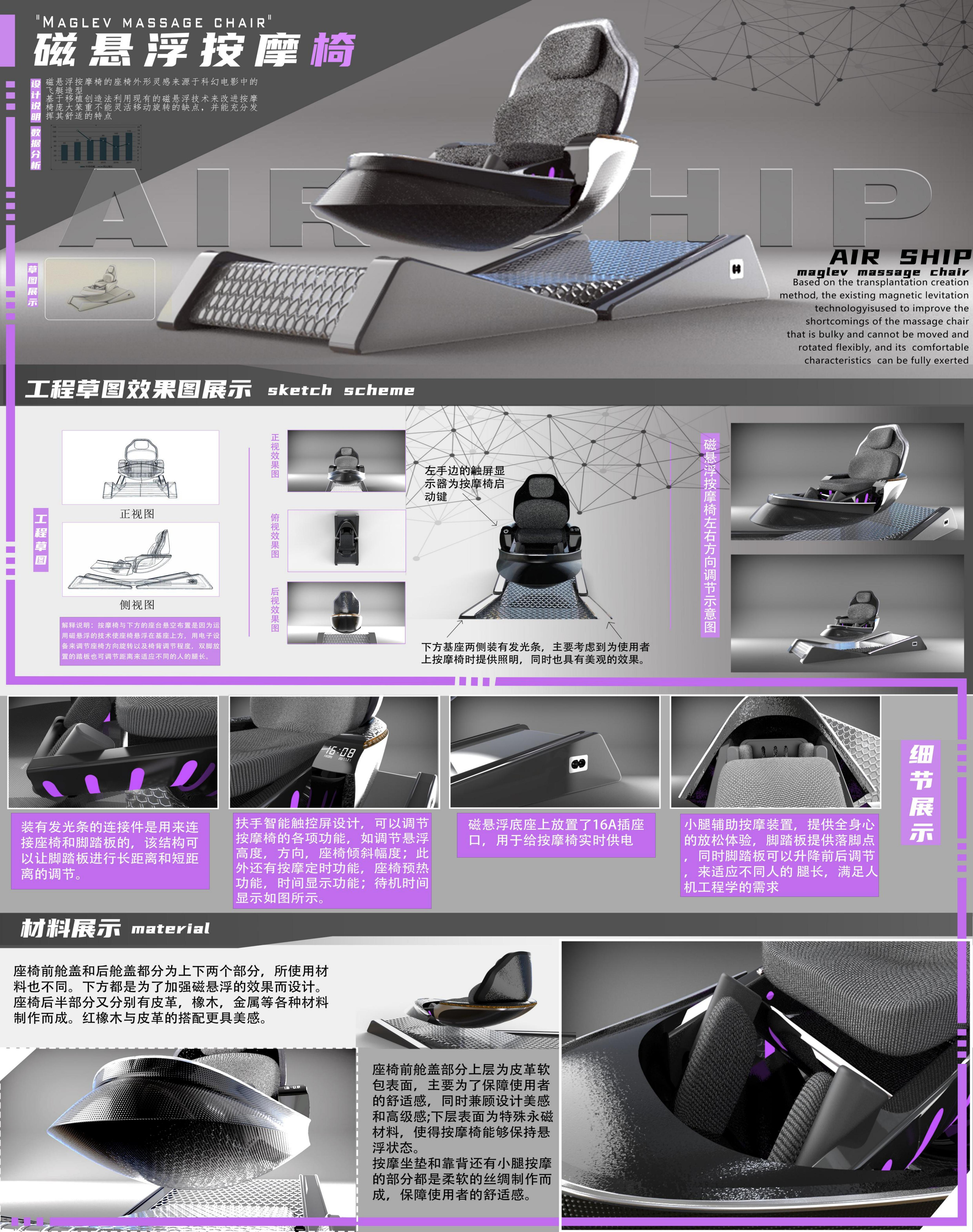 该作品的设计灵感来源于生活中的一体式按摩椅过于笨重,难以移动和调节尺寸不符合人机工程学且不够智能;该产品外观设计灵感来源于飞船的外观;该产品利用置换法将现在的磁悬浮技术和按摩椅结合,使按摩椅也能够更灵活地使用。磁悬浮技术的实现主要依靠“飞船”下方的超磁材料和基座提供的电能实现。扶手的触摸屏设计提供了更加智能方便的使用体验。