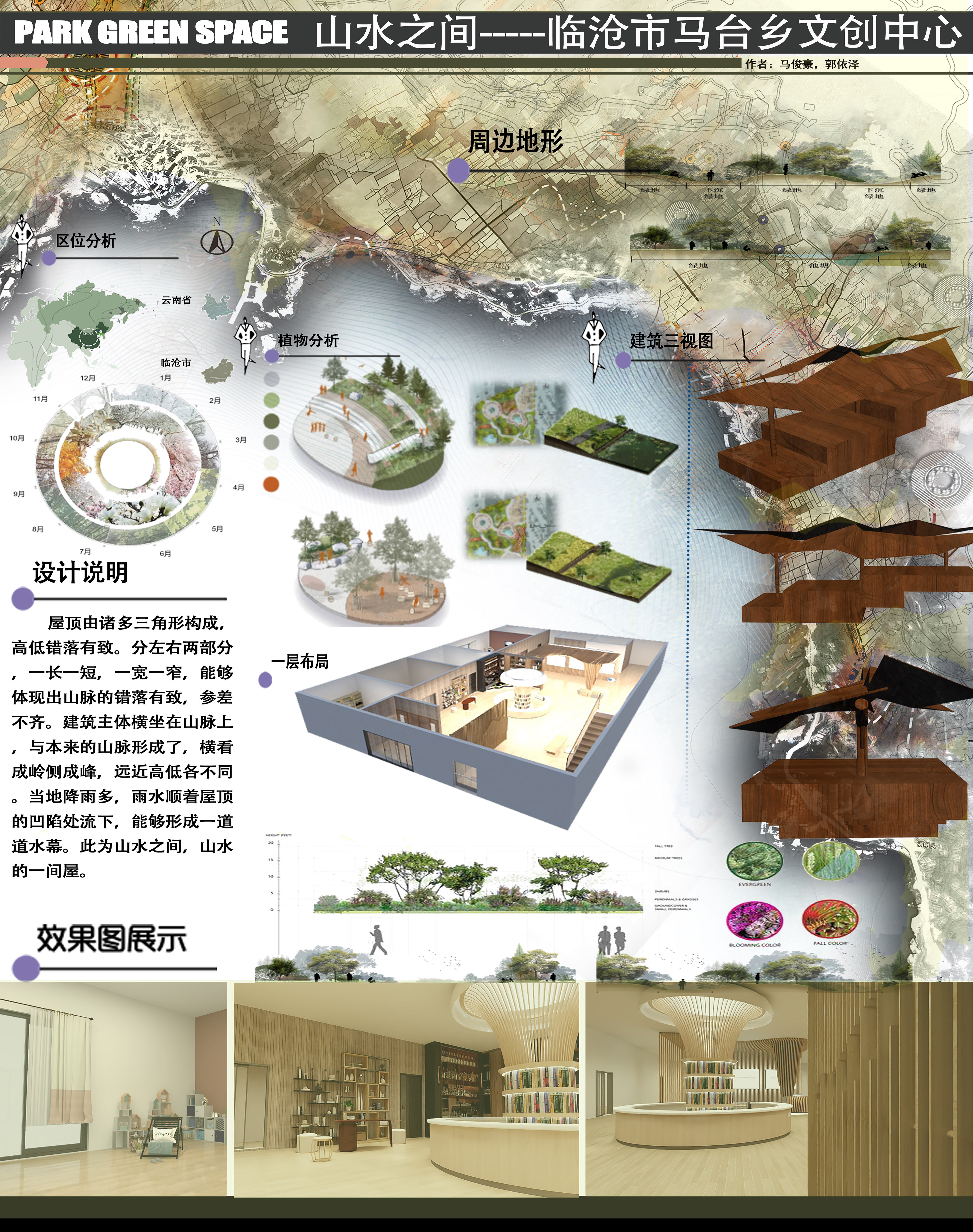 屋顶由诸多三角形构成,高低错落有致。分左右两部分,一长一短,一宽一窄,能够体现出山脉的错落有致,参差不齐。建筑主体横坐在山脉上,与本来的山脉形成了,横看成岭侧成峰,远近高低各不同。当地降雨多,雨水顺着屋顶的凹陷处流下,能够形成一道道水幕。此为山水之间,山水的一间屋。