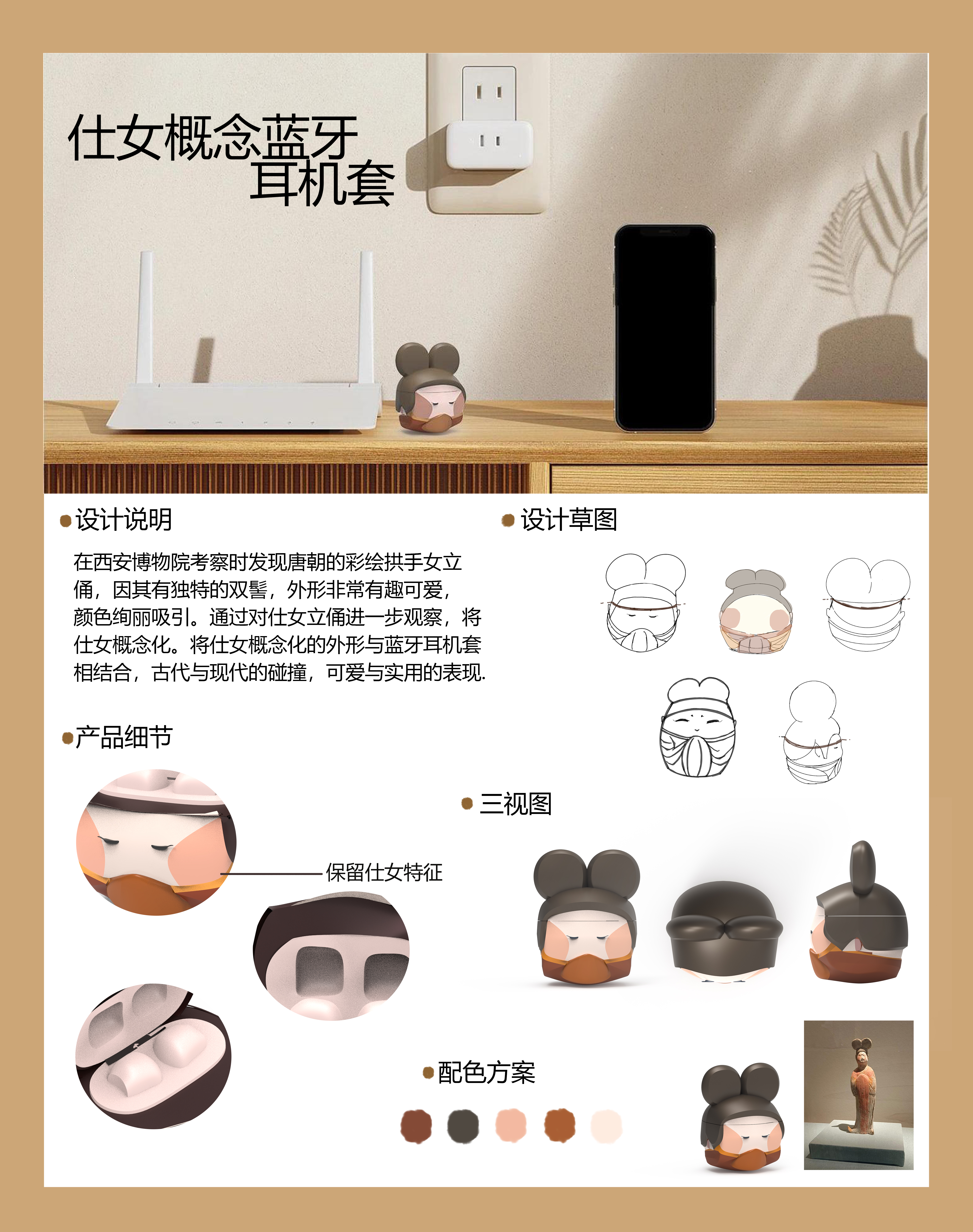 在西安博物院考察时发现唐朝的彩绘拱手女立俑,因其有独特的双髻,外形非常有趣可爱,颜色绚丽吸引。通过对仕女立俑进一步观察,将仕女概念化。将仕女概念化的外形与蓝牙耳机套相结合,古代与现代的碰撞,可爱与实用的表现.