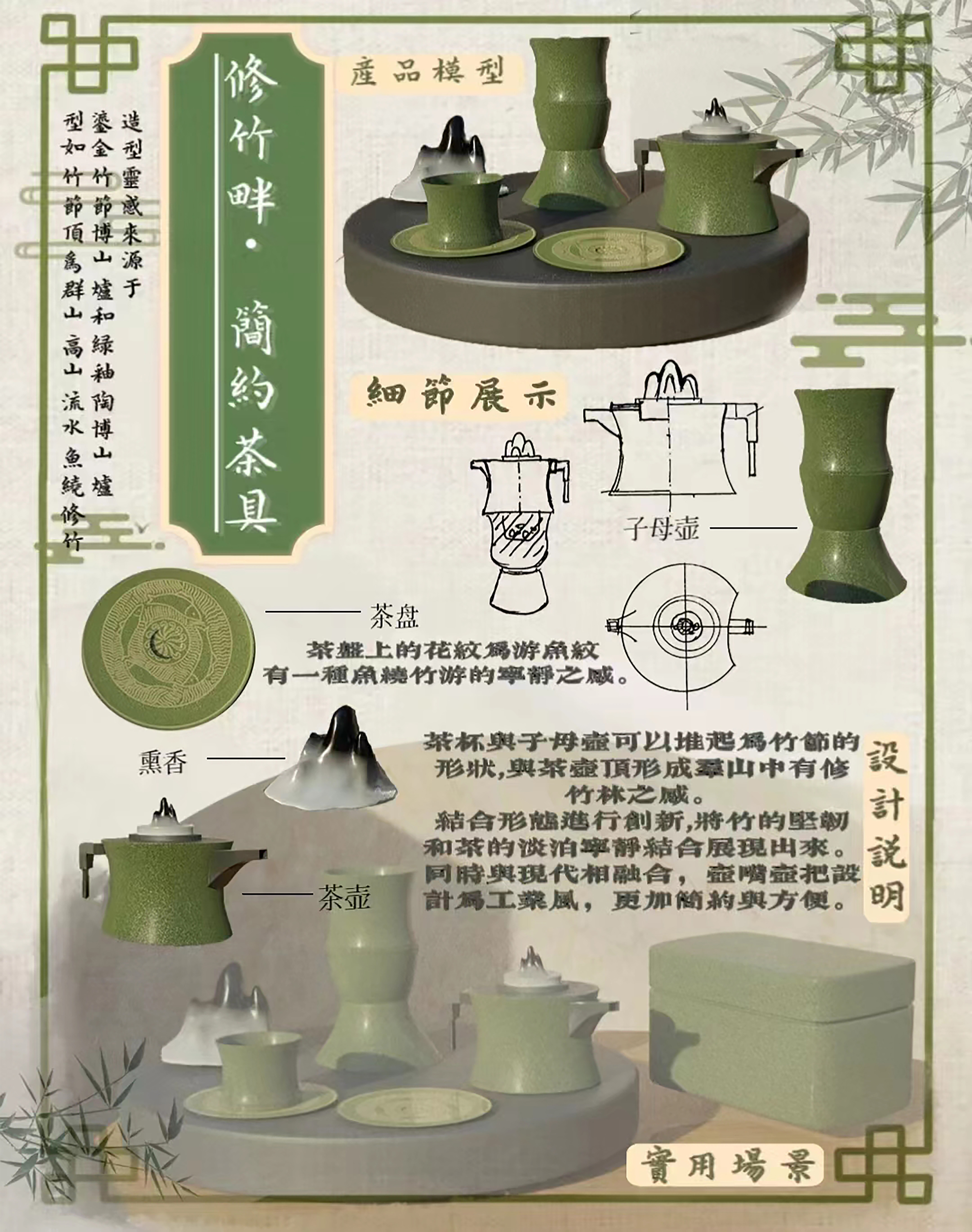 灵感来源于鎏金竹节博山炉和绿釉陶莲瓣博山炉。茶具可以堆起为竹节的形状,群山中有修竹林,茶盘上的花纹为游鱼纹,有一种鱼绕竹游的宁静之感。结合形态进行创新,将竹的坚韧和茶的淡泊宁静展现出来同时与现代相融合,壶嘴壶把设计为工业风,更加简约与方便。
