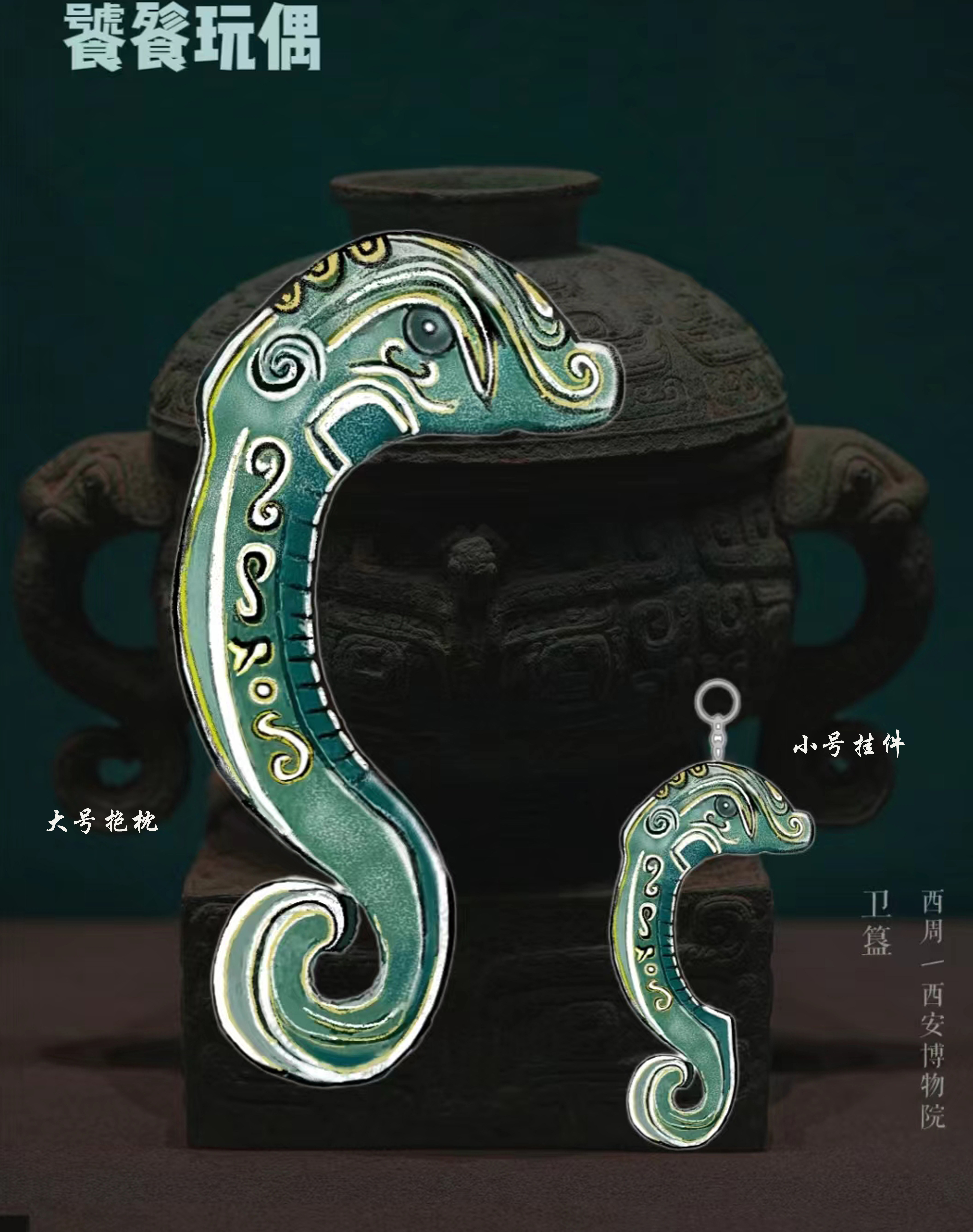 本方案设计理念来自于西周卫簋双耳中的饕餮兽。围绕文物文化保护与文化传播为主题将西周青铜器与“潮玩”相结合打造出了一款饕餮玩偶,大号可做抱枕,小号可做挂件。饕餮在传统文化中饕餮往往寓意“嘴大吃四方”“贪吃贪睡鬼”被认为有招财、灭小人等寓意。也是保护者的角色,用拥抱守护自己的主人,希望拥有它的人,每天都能够感受到被爱,被拥抱被拥有的幸福感。其面料为:毛绒布面料/绒毛面料+彩色丝线。
