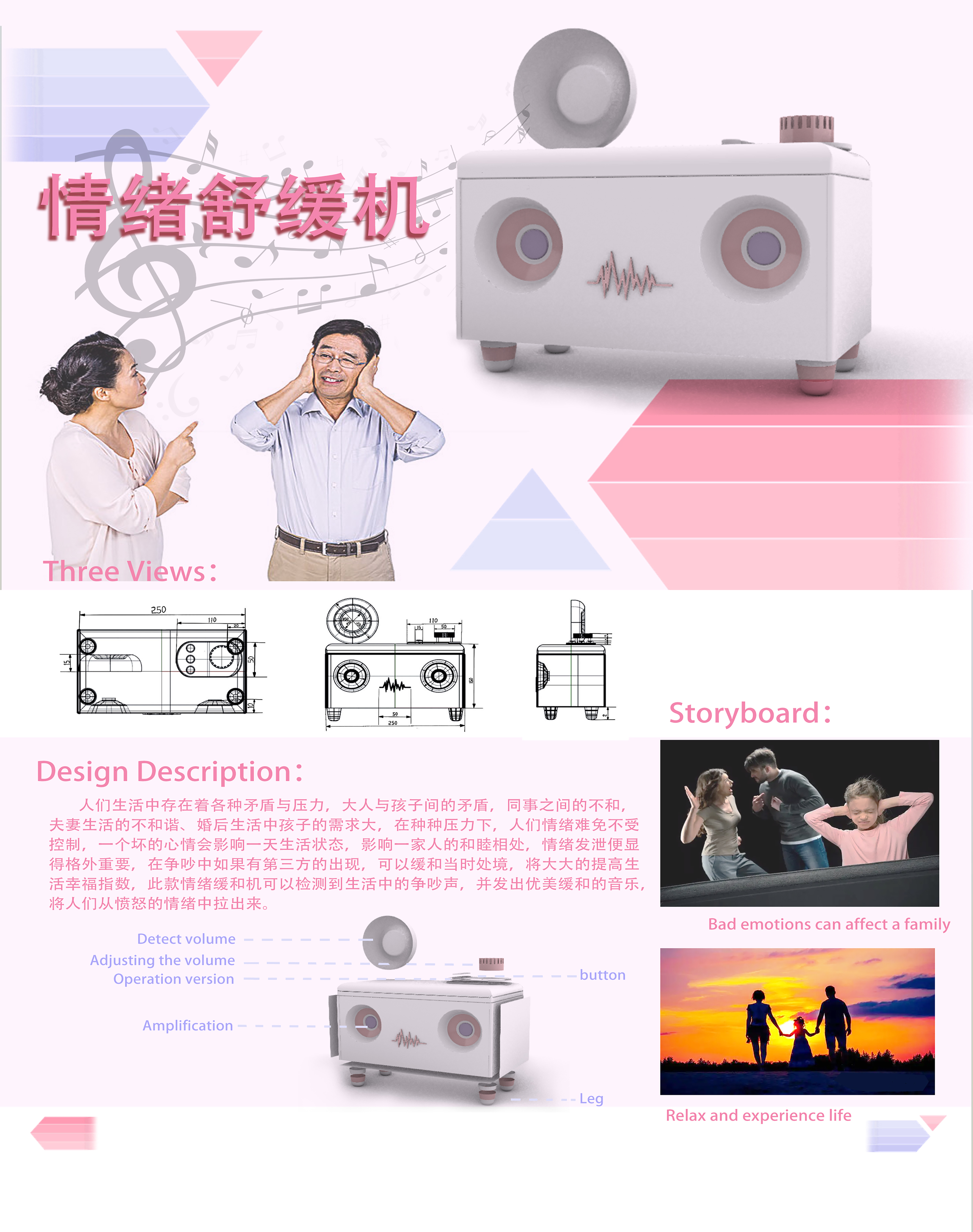 人们生活中存在着各种矛盾与压力,大人与孩子间的矛盾,同事之间的不和,夫妻生活的不和谐、婚后生活中孩子的需求大,在种种压力下,人们情绪难免不受控制,一个坏的心情会影响一天生活状态,影响一家人的和睦相处,情绪发泄便显得格外重要,在争吵中如果有第三方的出现,可以缓和当时处境,将大大的提高生活幸福指数,此款情绪缓和机可以检测到生活中的争吵声,并发出优美缓和的音乐,将人们从愤怒的情绪中拉出来。
