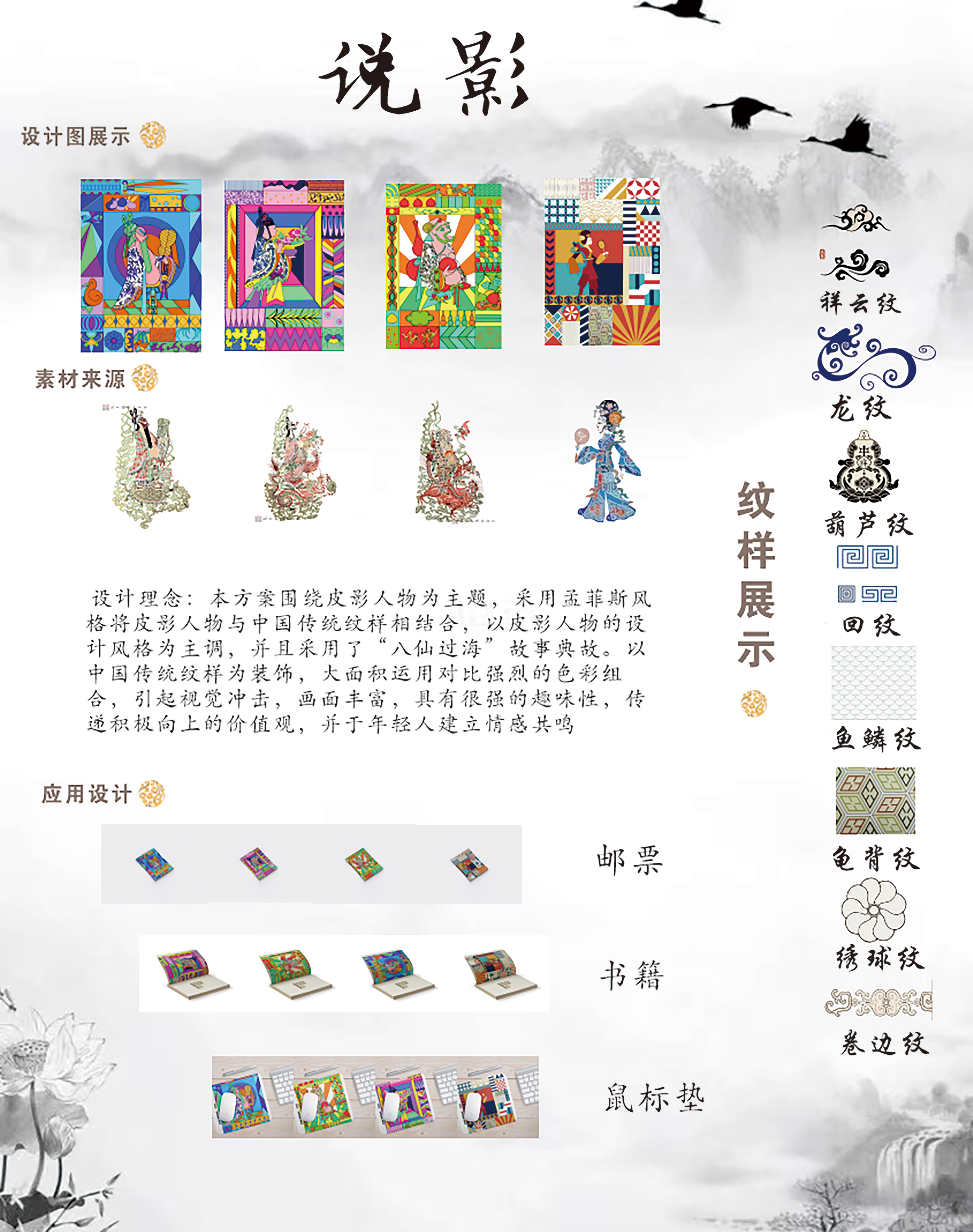 本方案围绕皮影人物为主题,采用孟菲斯风格将皮影人物与中国传统纹样相结合,以皮影人物的设计风格为主调,并且采用“八仙过海”故事典故。以中国传统纹样为装饰,大面积运用对比强烈的色彩组合,引起视觉冲击,画面丰富,具有很强的趣味性,传递积极向上的价值观,并于年轻人建立情感共鸣。