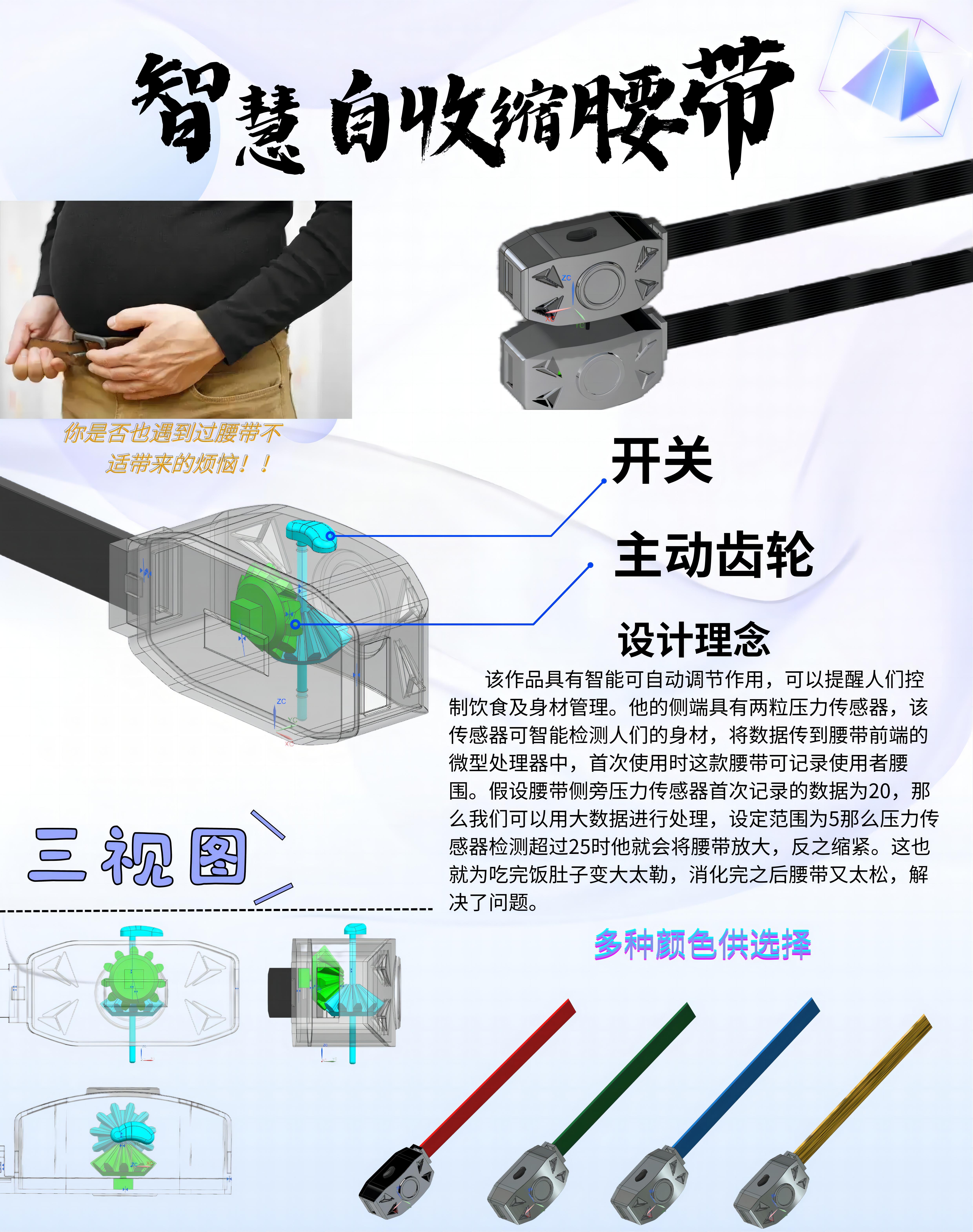 该作品具有智能可自动调节作用,可以提醒人们控制饮食及身材管理。他的侧端具有两粒压力传感器,该传感器可智能检测人们的身材,将数据传到腰带前端的微型处理器中,首次使用时这款腰带可记录使用者腰围。假设腰带侧旁压力传感器首次记录的数据为20,那么我们可以用大数据进行处理,设定范围为5那么压力传感器检测超过25时他就会将腰带放大,反之缩紧。这也就为吃完饭肚子变大太勒,消化完之后腰带又太松,解决了问题。