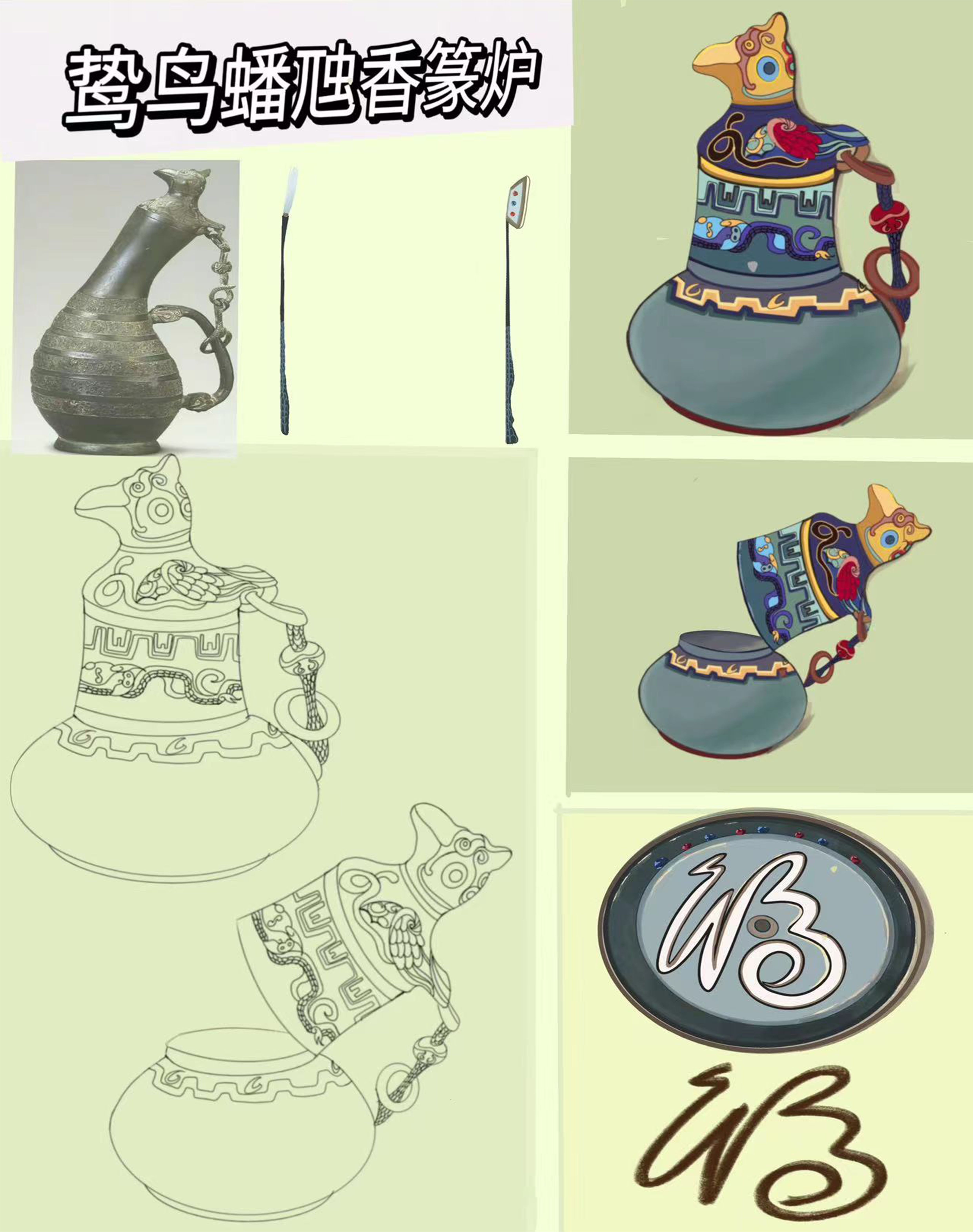 本方案围绕战国的文物鸟盖壶为主题,与古代的香薰炉结合,更具有现代感。以蛇纹的线条为主进行装饰。