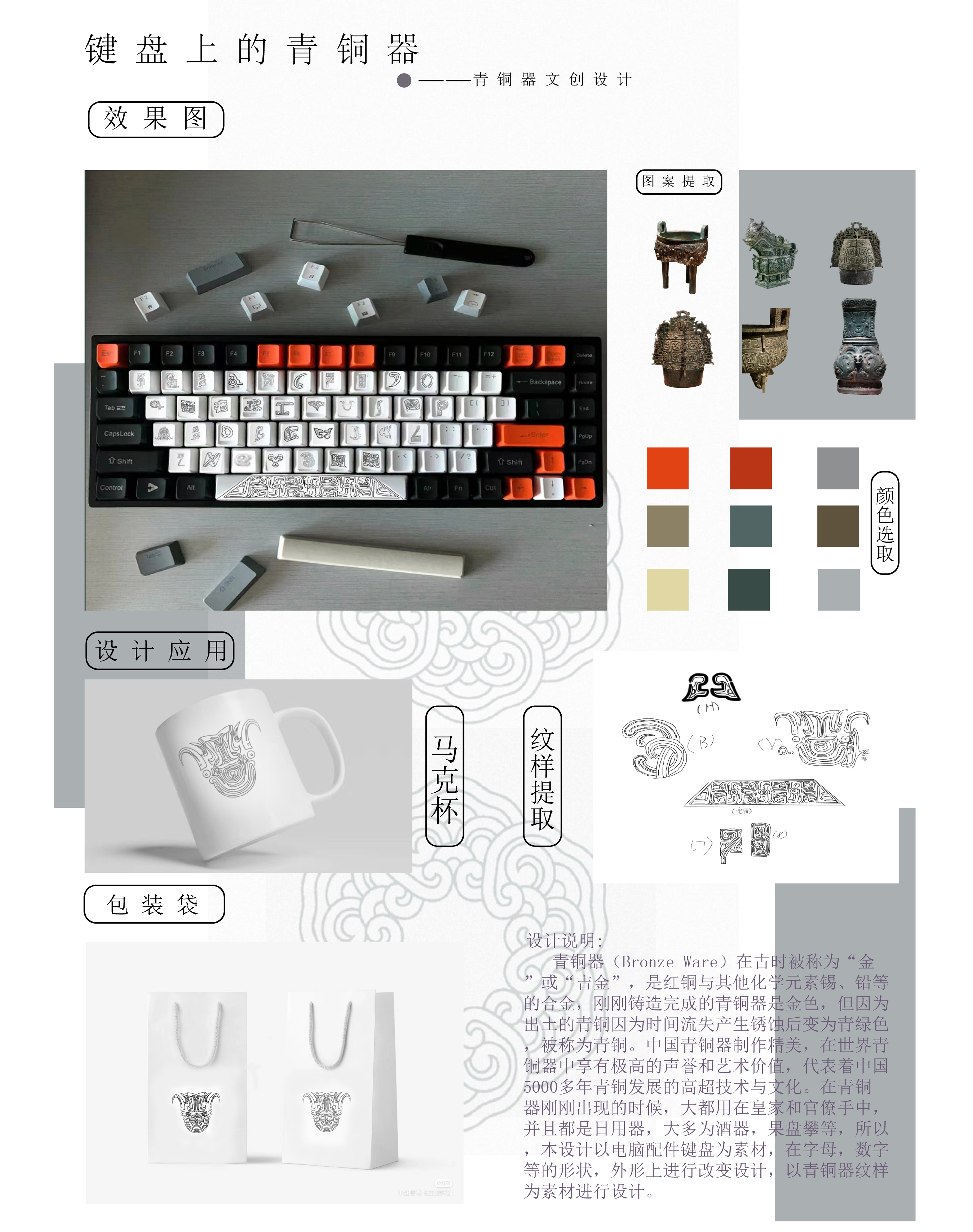 设计说明: 青铜器(Bronze Ware)在古时被称为“金”或“吉金”,是红铜与其他化学元素锡、铅等的合金,刚刚铸造完成的青铜器是金色,但因为出土的青铜因为时间流失产生锈蚀后变为青绿色,被称为青铜。中国青铜器制作精美,在世界青铜器中享有极高的声誉和艺术价值。在青铜器刚刚出现的时候,大都用在皇家和官僚手中,本设计以电脑键盘为素材,在字母,数字外形上进行改变设计,以青铜器纹样为素材进行设计。