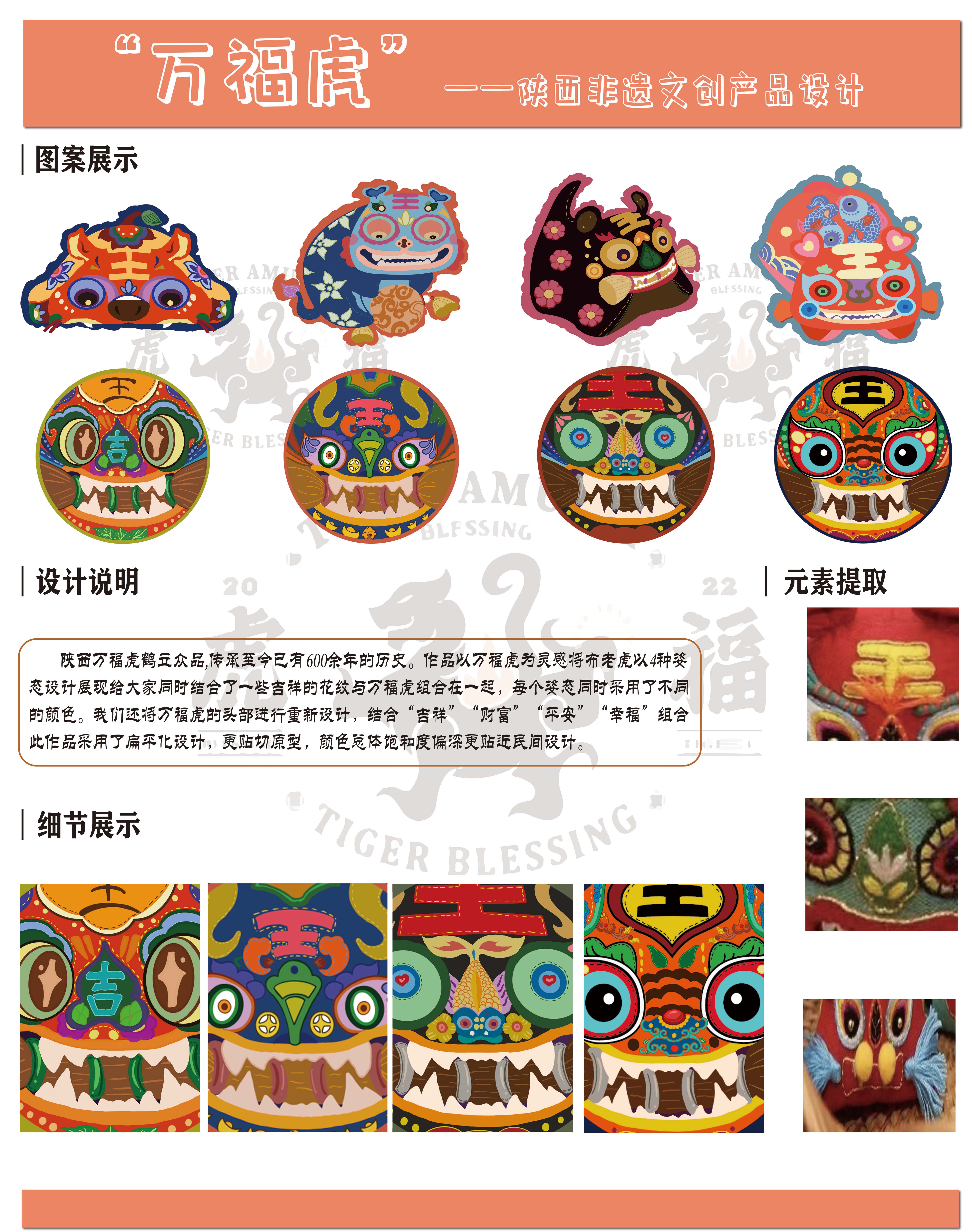 陕西万福虎鹤立众品,传承至今已有600余年的历史。作品以万福虎为灵感将布老虎以4种姿 态设计展现给大家同时结合了一些吉祥的花纹与万福虎组合在一起,每个姿态同时采用了不同 的颜色。我们还将万福虎的头部进行重新设计,结合“吉祥”“财富”“平安”“幸福”组合 此作品采用了扁平化设计,更贴切原型,颜色总体饱和度偏深更贴近民间设计。