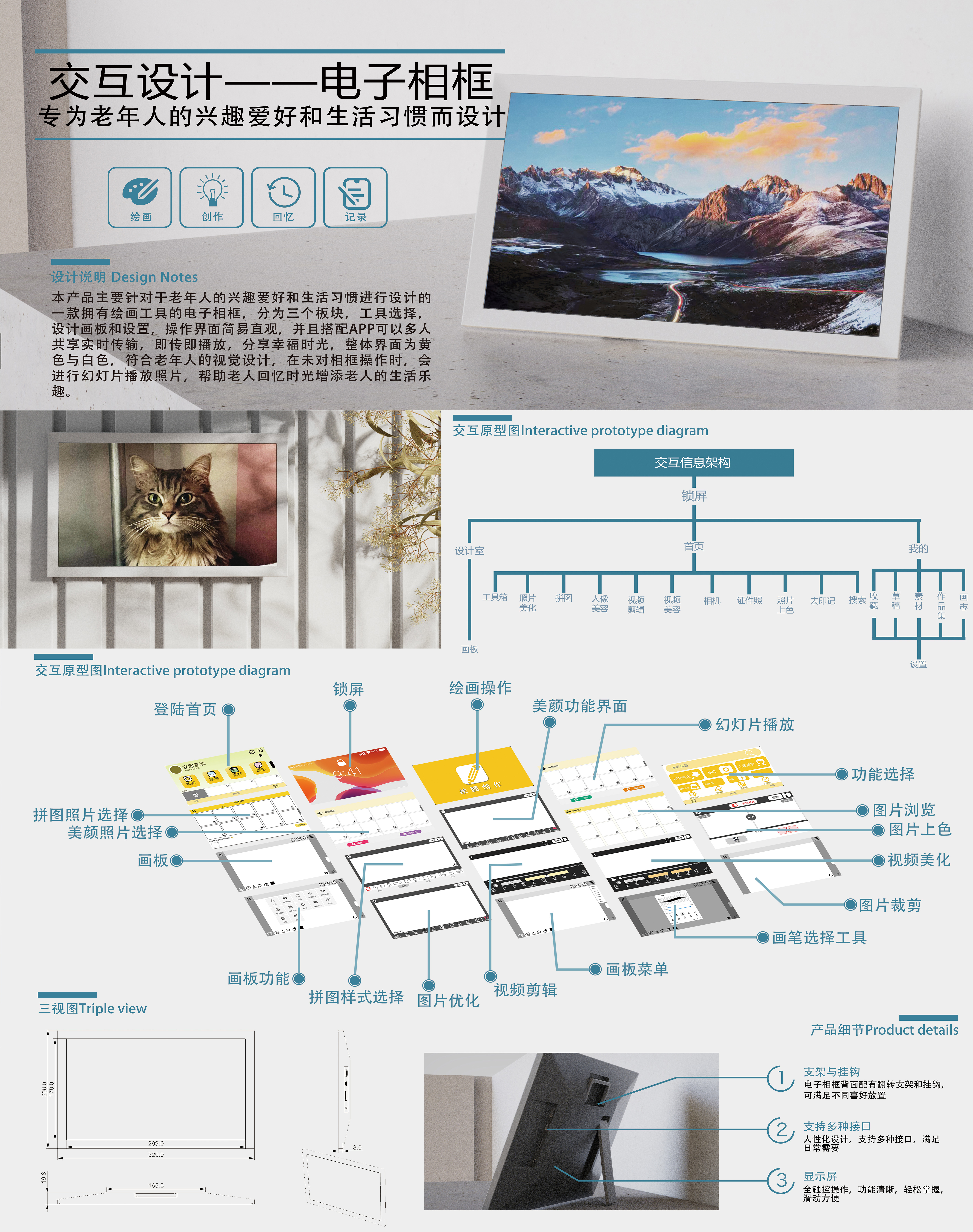 本产品主要针对老年人的兴趣爱好和生活习惯进行设计的一款拥有绘画工具的电子相框,分为三个板块,工具选择,设计画板和设置,操作界面简易直观,并且搭配APP可以多人共享实时传输,即传即播放,分享幸福时光,整体界面为黄色和白色,符合老年人的视觉设计,在未对相框操作时,会进行幻灯片播放照片,帮助老人回忆时光,增添老人的生活乐趣。