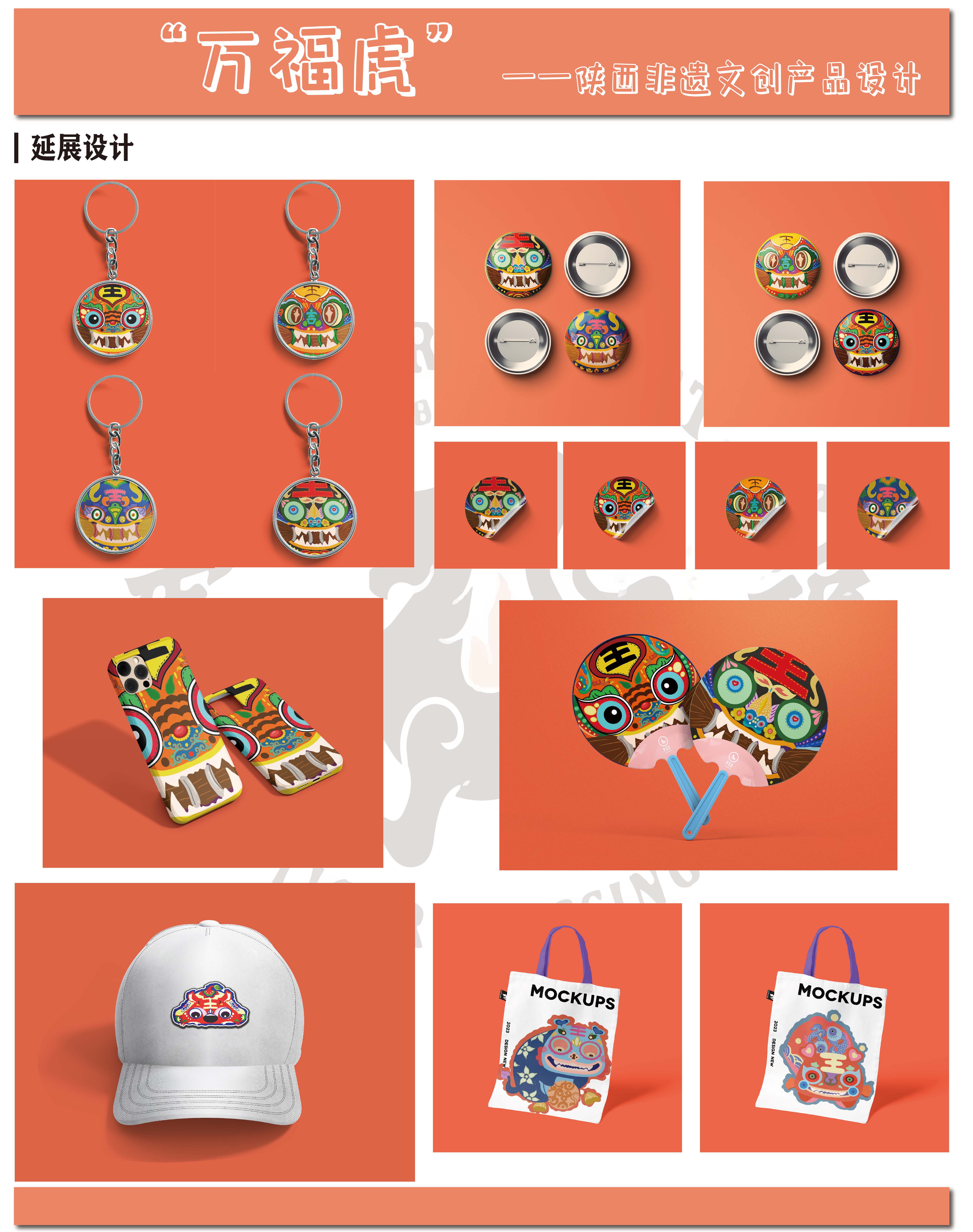 陕西万福虎鹤立众品,传承至今已有600余年的历史。作品以万福虎为灵感将布老虎以4种姿 态设计展现给大家同时结合了一些吉祥的花纹与万福虎组合在一起,每个姿态同时采用了不同 的颜色。我们还将万福虎的头部进行重新设计,结合“吉祥”“财富”“平安”“幸福”组合 此作品采用了扁平化设计,更贴切原型,颜色总体饱和度偏深更贴近民间设计。