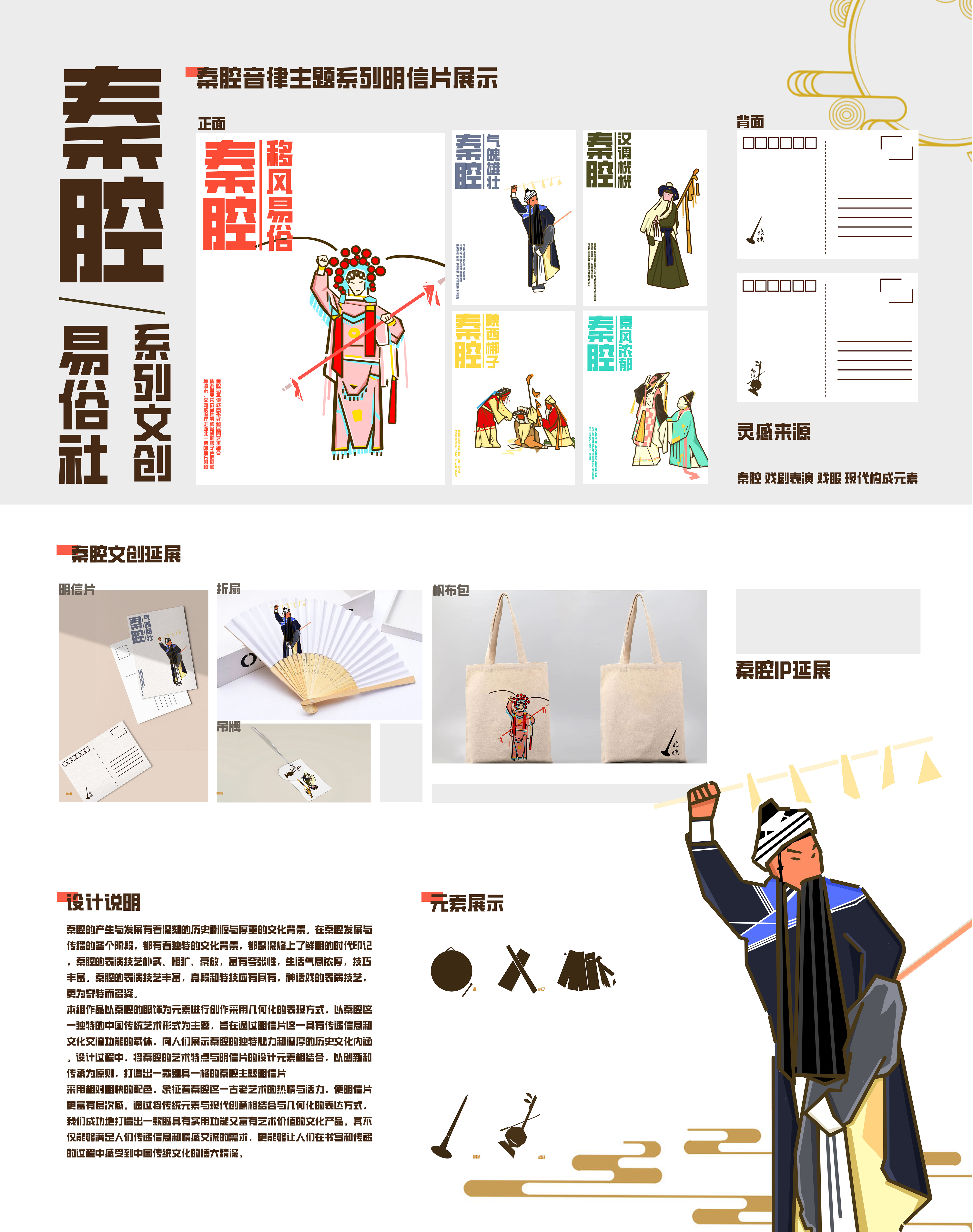 本组作品以秦腔的服饰为元素进行创作采用几何化的表现方式,以秦腔这一独特的中国传统艺术形式为主题,向人们展示秦腔的独特魅力和深厚的历史文化内涵。 设计过程中,将秦腔的艺术特点与明信片的设计元素相结合,以创新和传承为原则,配色鲜明象征着秦腔这一古老艺术的热情与活力,通过将传统元素与现代创意相结合与几何化的表达方式,我们成功地打造出一款既具有实用功能又富有艺术价值的文化产品。