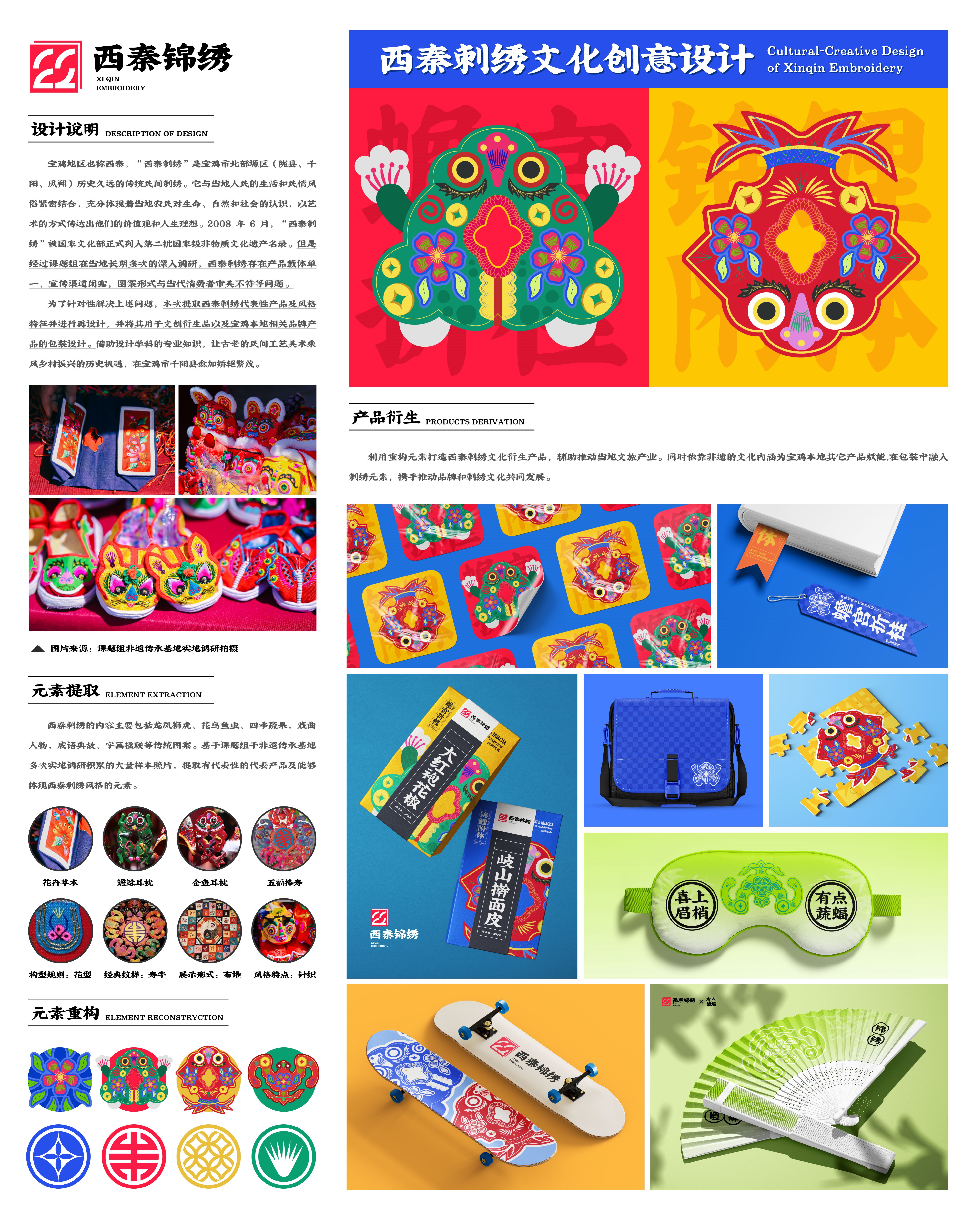 “西秦刺绣”是宝鸡市历史久远的传统民间刺绣。它充分体现着当地农民对生命、自然和社会的认识,以艺术的方式传达出他们的价值观和人生理想。但经过课题组长期多次的调研,西秦刺绣的传承和发展面临诸多问题。本次提取西秦刺绣代表性产品及风格特征并进行再设计,并将其用于文创衍生品以及宝鸡本地相关品牌产品的包装设计。借助设计学科的专业知识,让古老的民间工艺美术乘风乡村振兴的历史机遇,在宝鸡市千阳县愈加娇艳繁茂。