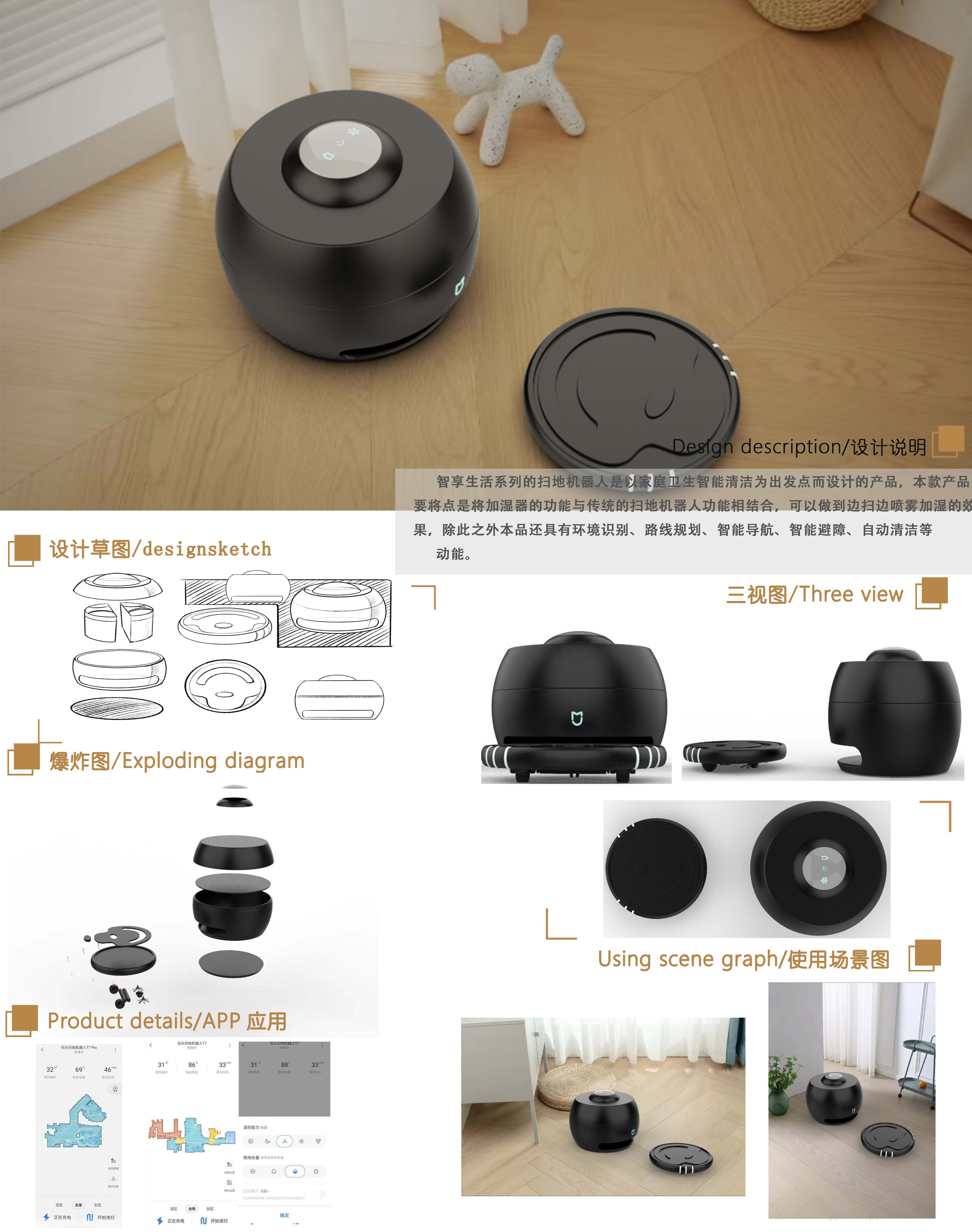 智享生活系列的扫地机器人是以家庭卫生智能清洁为出发点而设计的产品,本款产品主要将点是将加湿器的功能与传统的扫地机器人功能相结合,可以做到边扫边喷雾加湿的效果,除此之外本产品还具有环境识别、路线规划、智能导航、智能避障、自动清洁等动能。