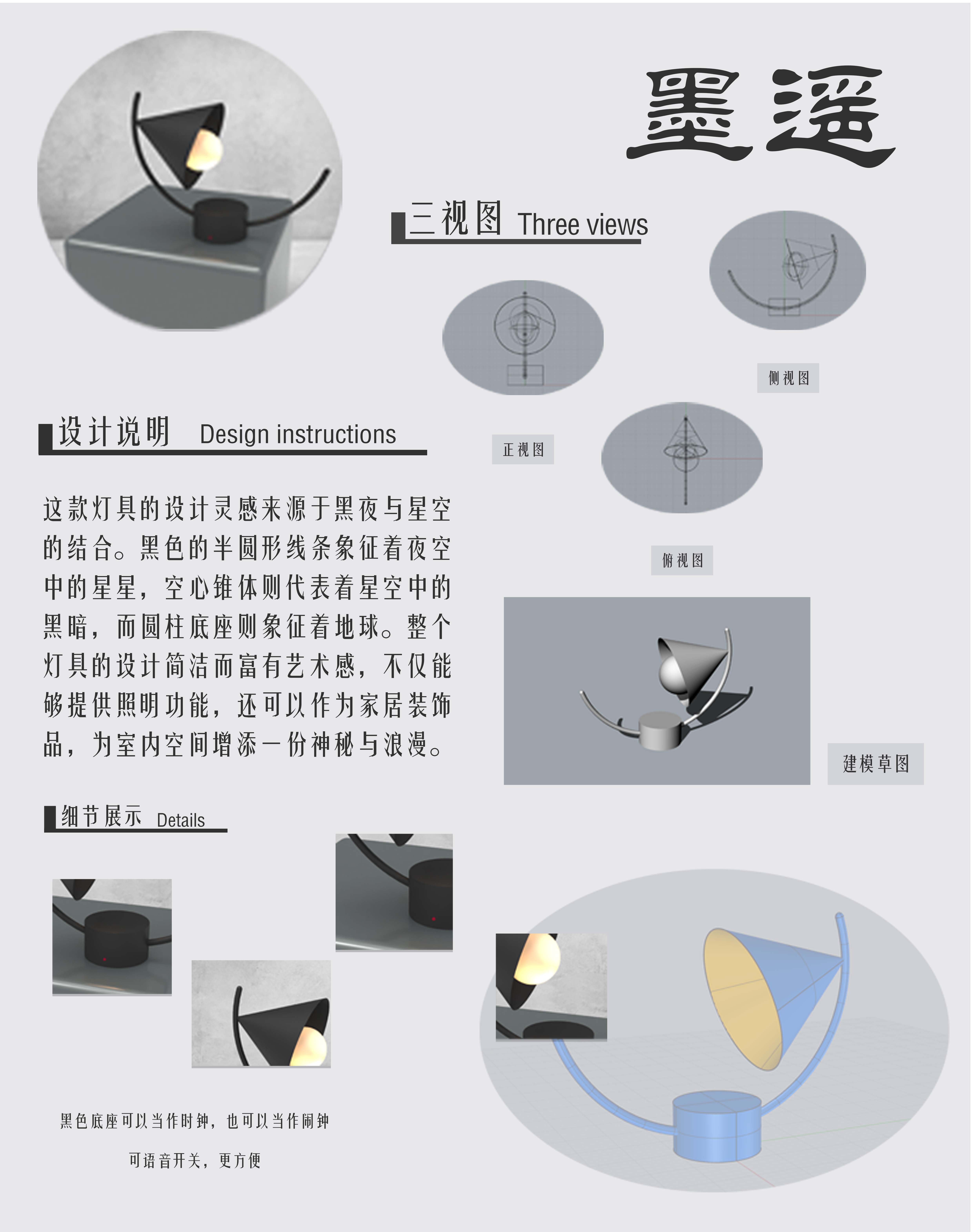 这款灯具的设计灵感来源于黑夜与星空的结合。黑色的半圆形线条象征着夜空中的星星,空心锥体则代表着星空中的黑暗,而圆柱底座则象征着地球。整个灯具的设计简洁而富有艺术感,不仅能够提供照明功能,还可以作为家居装饰品,为室内空间增添一份神秘与浪漫。