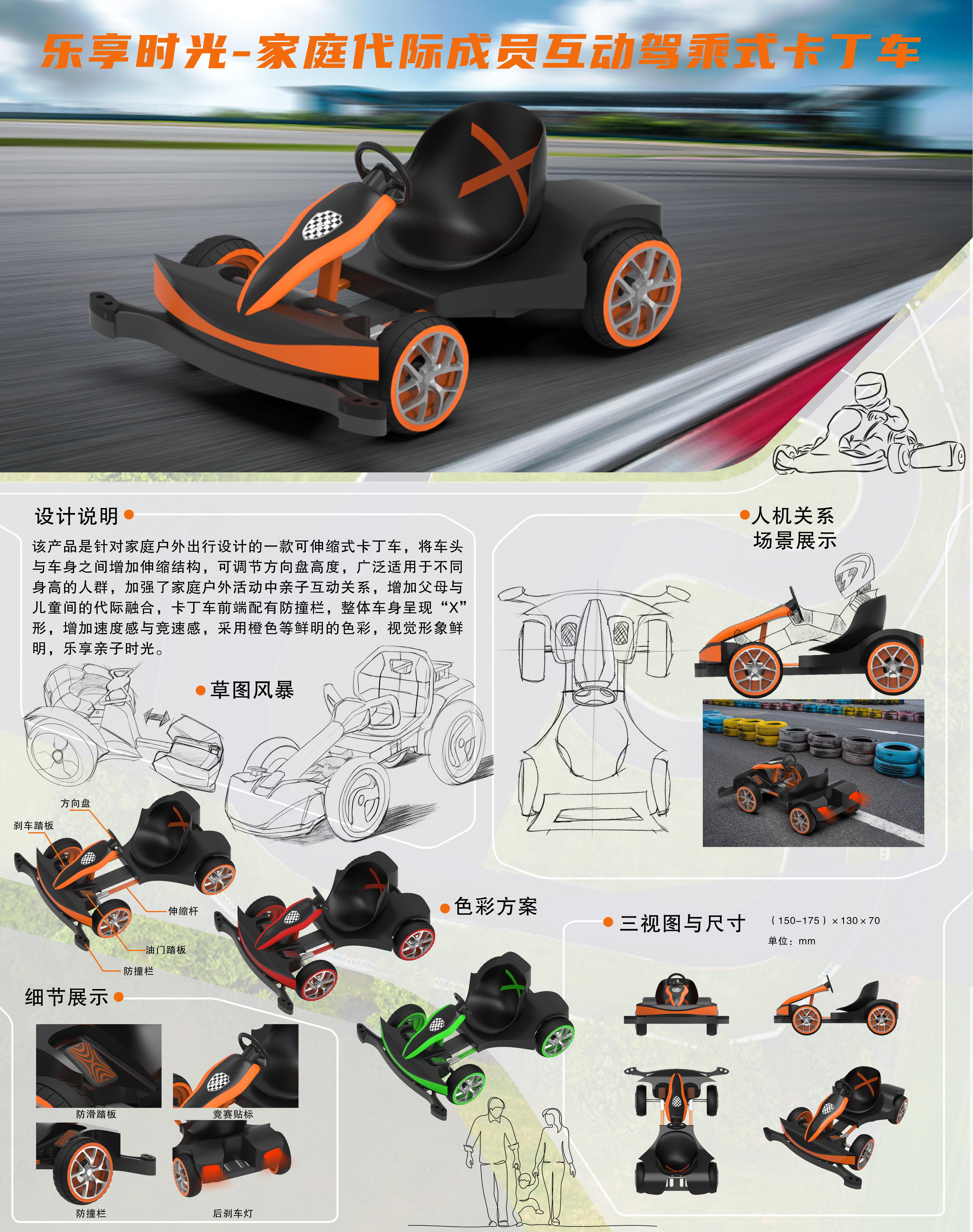 该产品是针对家庭户外出行设计的一款可伸缩式卡丁车,将车头与车身之间增加伸缩结构,可调节方向盘高度,广泛适用于不同身高的人群,加强了家庭户外活动中亲子互动关系,增加父母与儿童间的代际融合,卡丁车前端配有防撞栏,整体车身呈现“X”形,增加速度感与竞速感,采用橙色等鲜明的色彩,视觉形象鲜明,乐享亲子时光。