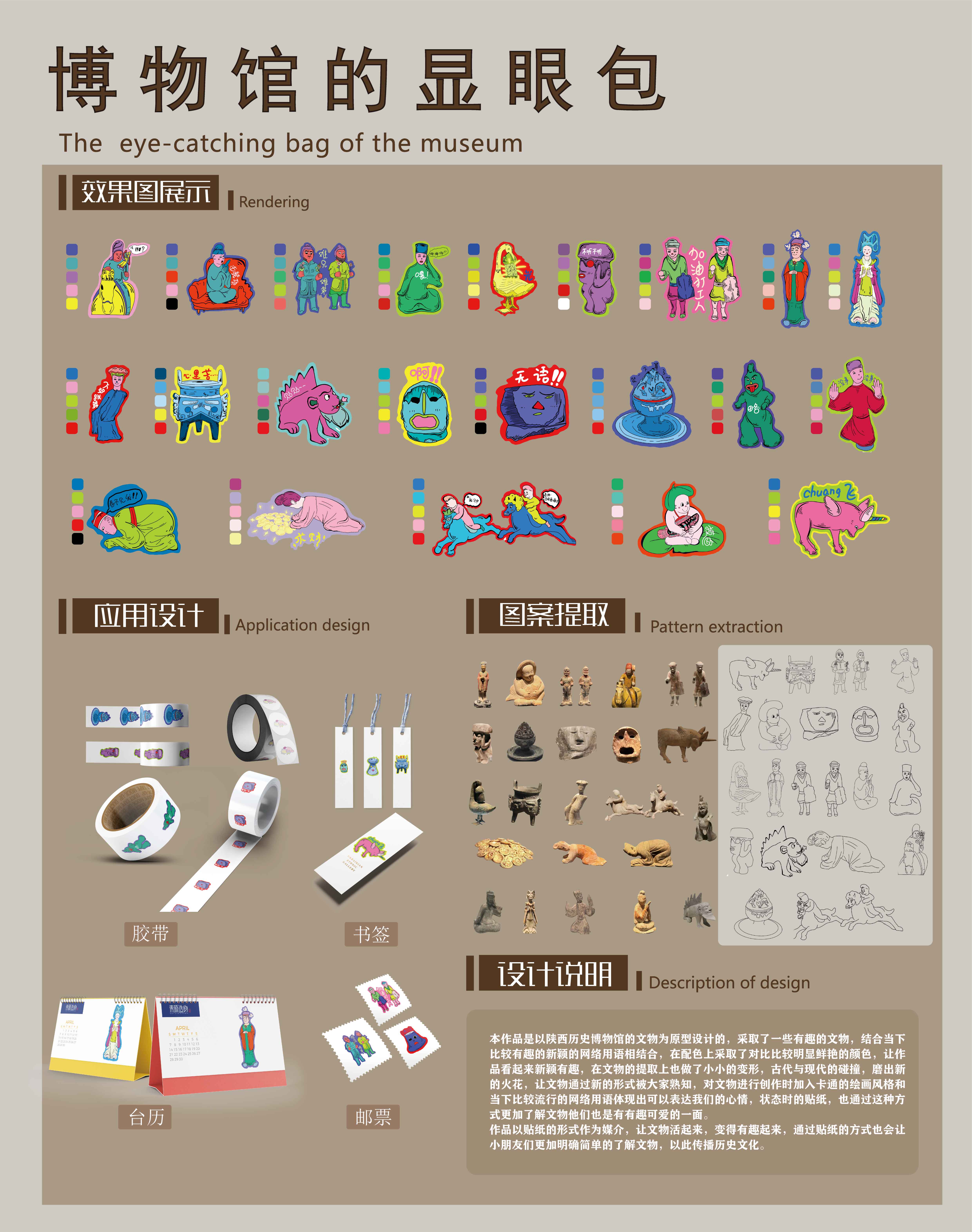 本作品是以陕西历史博物馆的文物为原型设计的采取了一些有趣的文物结合当下比较有趣的新颖的网络用语相结合,让作品看起来新颖有趣在文物的提取上也做了变形古代与现代的碰撞磨出新的火花让文物通过新的形式被大家熟知对文物进行创作时加入卡通的绘画风格和当下比较流行的网络用语体现出可以表达我们的心情状态时的贴纸作品以贴纸的形式作为媒介让文物活起来通过贴纸的方式也会让小朋友们更加明确简单的了解文物以此传播历史文化。